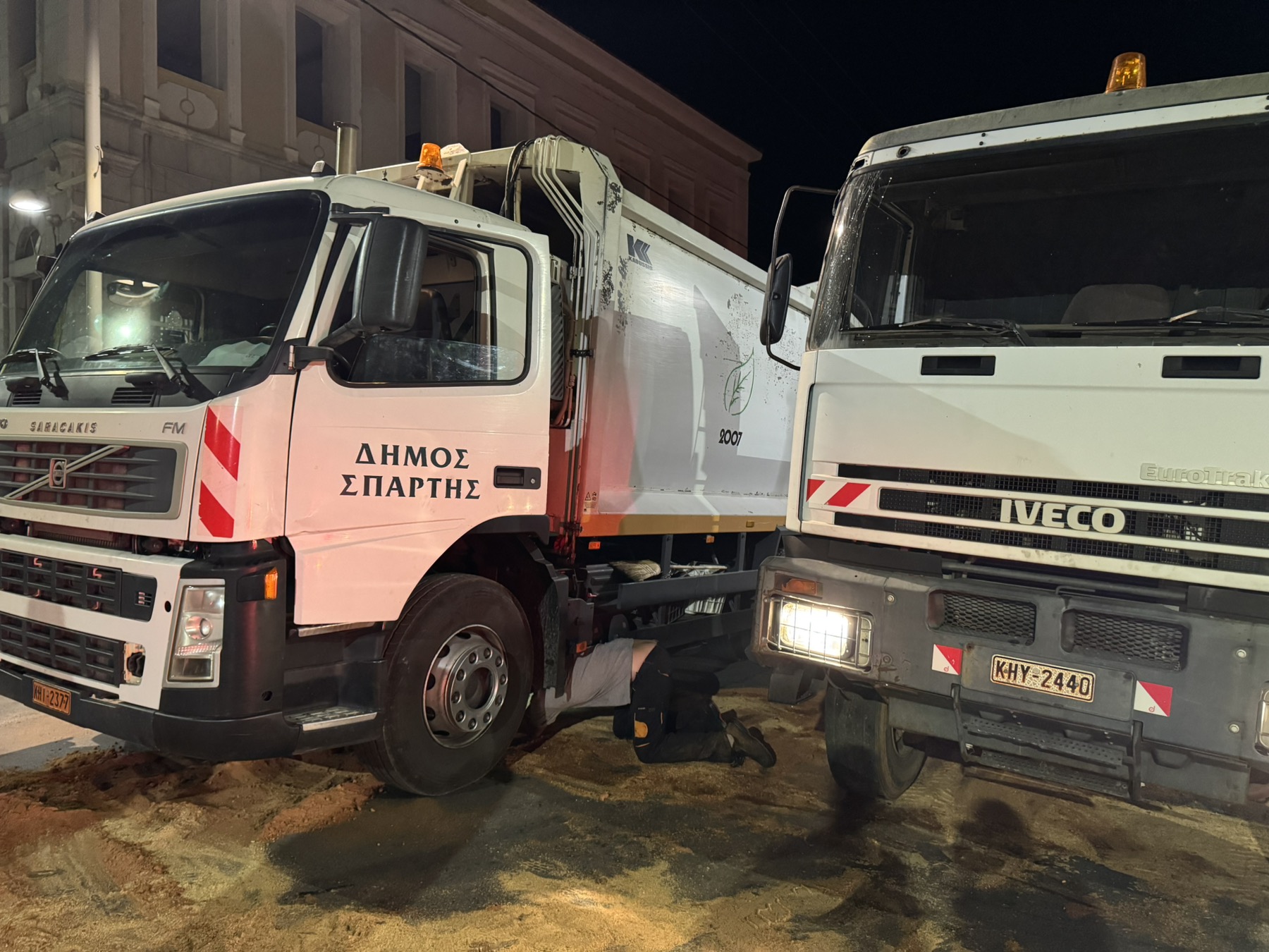 Ένα απρόοπτο σημειώθηκε τις προάλλες κατά τη νυχτερινή βάρδια της αποκομιδής απορριμμάτων στη Σπάρτη. Απορριμματοφόρο που ακολουθούσε το καθιερωμένο δρομολόγιο επί της οδού Λεωνίδου, υπέστη μηχανική βλάβη, με συνέπεια να ακινητοποιηθεί στη συμβολή με τη Λυκούργου, έξω από τη Λέσχη Αξιωματικών. Όπως διαπιστώθηκε από τον έλεγχο, η βλάβη χτύπησε σε εξάρτημα στον «σταυρό» τού φορτηγού, με αποτέλεσμα μάλιστα διαρροή υγρών στο οδόστρωμα. Αν και η ώρα ήταν περασμένη, κλήθηκε μηχανικός που έδωσε μια προσωρινή λύση, ώστε το όχημα να απομακρυνθεί από το σημείο και να αποκατασταθεί η κυκλοφορία. Σημειωτέον ότι το όχημα είχε πρόσφατα παραληφθεί από συνεργείο, όπου είχε μεταφερθεί για επισκευή.