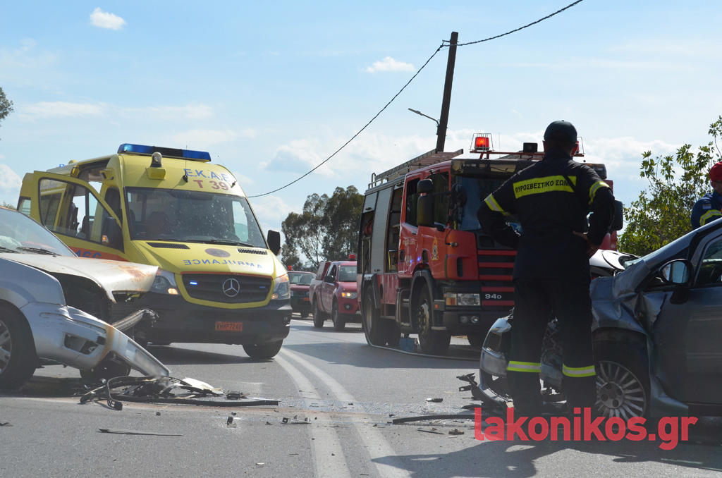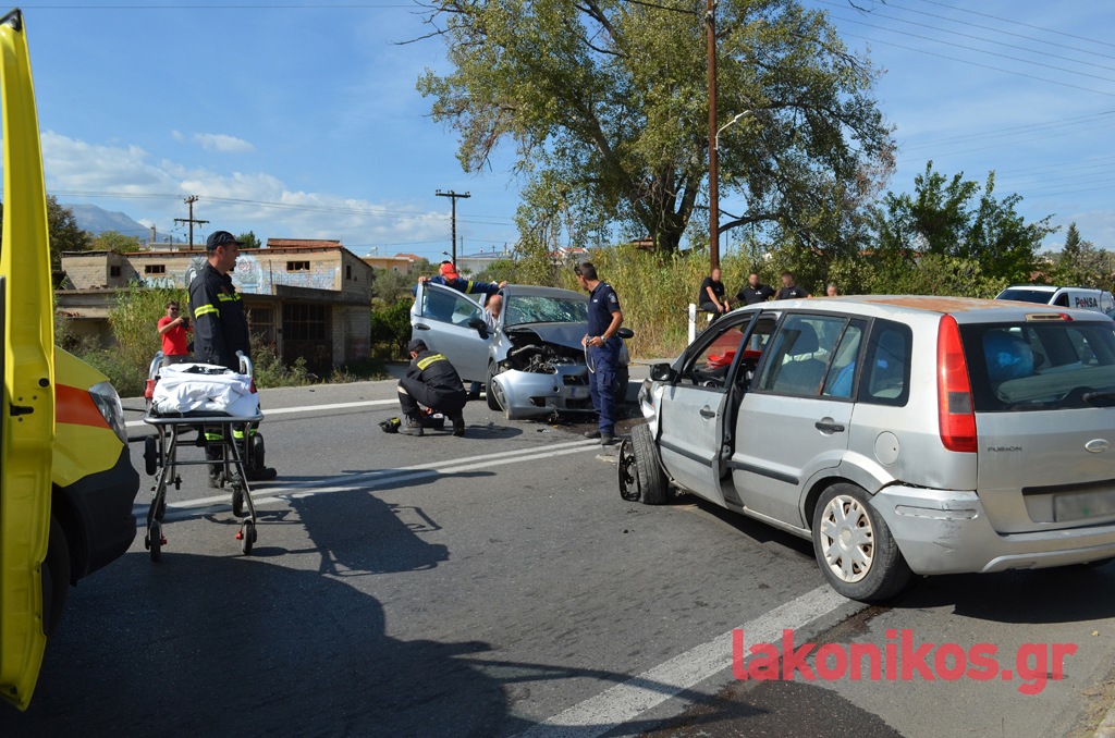 Στα αυτοκίνητα επέβαιναν συνολικά πέντε άτομα, που φέρονται να υπέστησαν ελαφρείς τραυματισμούς. Στο ένα όχημα βρίσκονταν ένα ζευγάρι ηλικιωμένων με τον εγγονό τους και στο δεύτερο μια μητέρα με την κόρη της. Όλοι διεκομίσθησαν στο Νοσοκομείο Σπάρτης για να τους παρασχεθούν οι πρώτες βοήθειες και να υποβληθούν στις απαραίτητες εξετάσεις. Η αρχική ενημέρωση, σύμφωνα με πληροφορίες, αναφέρει πως τα κυριότερα τραύματα ορισμένων εκ των εμπλεκομένων είναι ορθοπεδικής φύσεως, χωρίς πάντως η κατάστασή τους να εμπνέει λόγους ανησυχίας και να διατρέχει κίνδυνο η ζωή τους. Και τα δύο οχήματα υπέστησαν εκτεταμένες υλικές ζημιές.