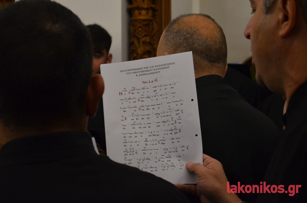 Τους ύμνους κατά τη διάρκεια της τελετής απέδωσε άριστα η χορωδία τής Σχολής Βυζαντινής Μουσικής «Πέτρος ο Λακεδαιμόνιος» τής ΙΜΜΣ, υπό τον υπεύθυνο της Σχολής και πρωτοψάλτη του Μητροπολιτικού Ναού Σπάρτης, Παναγιώτη Χρόνη.