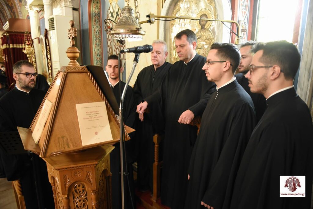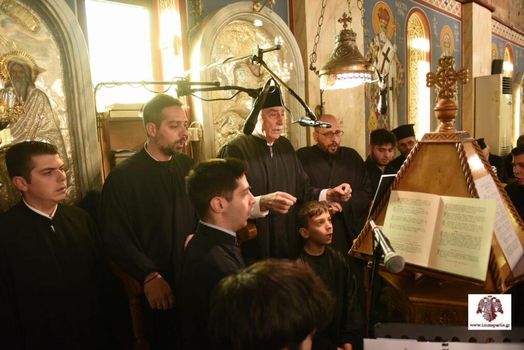 Όπως κατά την τέλεση της δοξολογίας και του πανηγυρικού Πατριαρχικού Εσπερινού, και κατά την κυριώνυμο ημέρα, άριστη ήταν η παρουσία των καλλικέλαδων ιεροψαλτών. Στο δεξιό αναλόγιο έψαλαν μέλη του Συλλόγου Ιεροψαλτών Λακωνίας «Πέτρος ο Πελοποννήσιος», με χοράρχη τον πρωτοψάλτη Παναγιώτη Τζανάκο, Άρχοντα Μαΐστορα της Μεγάλης Εκκλησίας. Στο αριστερό αναλόγιο έψαλαν μέλη τής χορωδίας τής Μητρόπολης Μαντινείας & Κυνουρίας, με χοράρχη τον πρωτοψάλτη τού Μητροπολιτικού Ναού Τρίπολης και καθηγητή εκκλησιαστικής μουσικής, Βασίλειο Γεωργαρά.