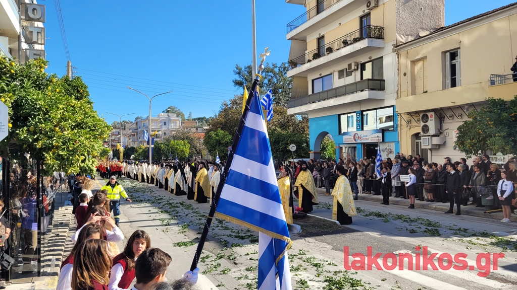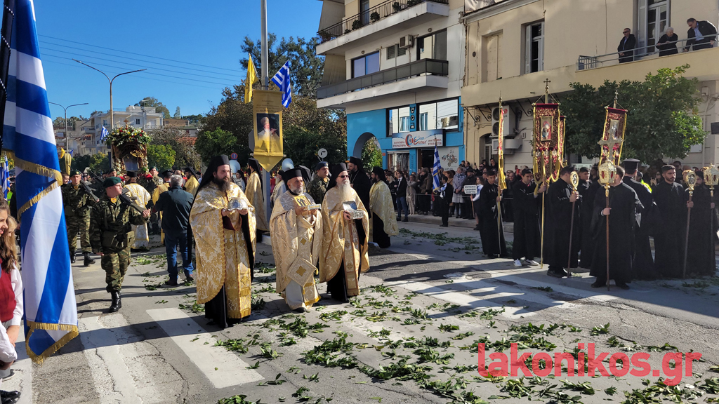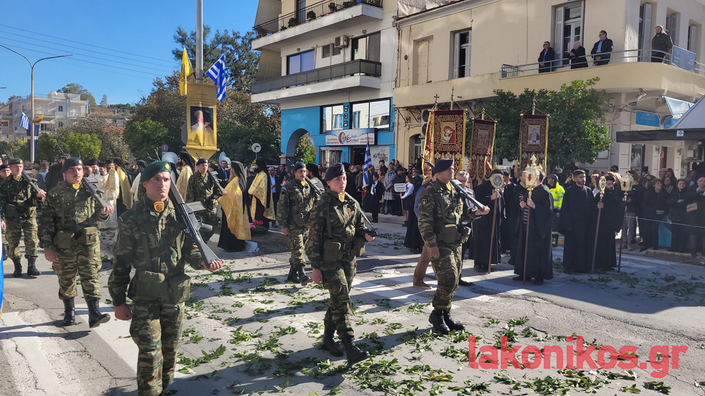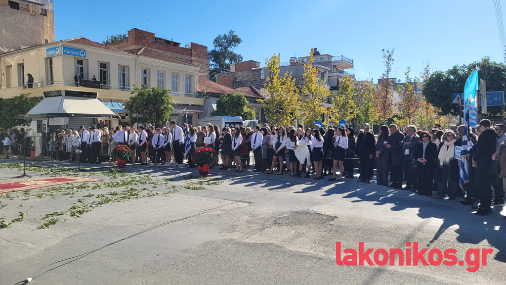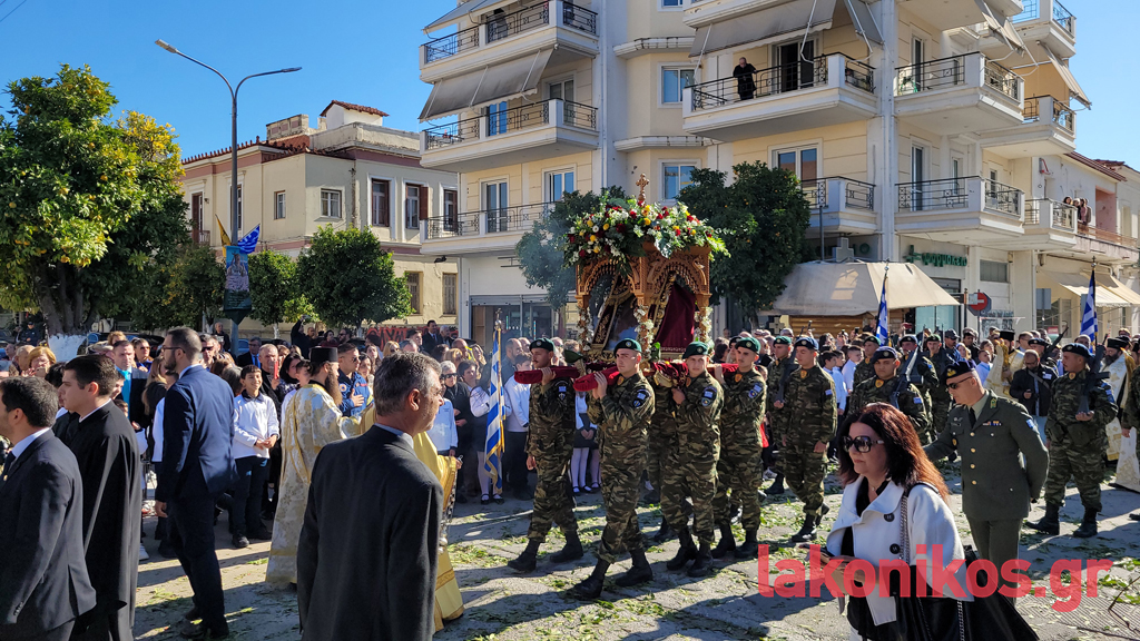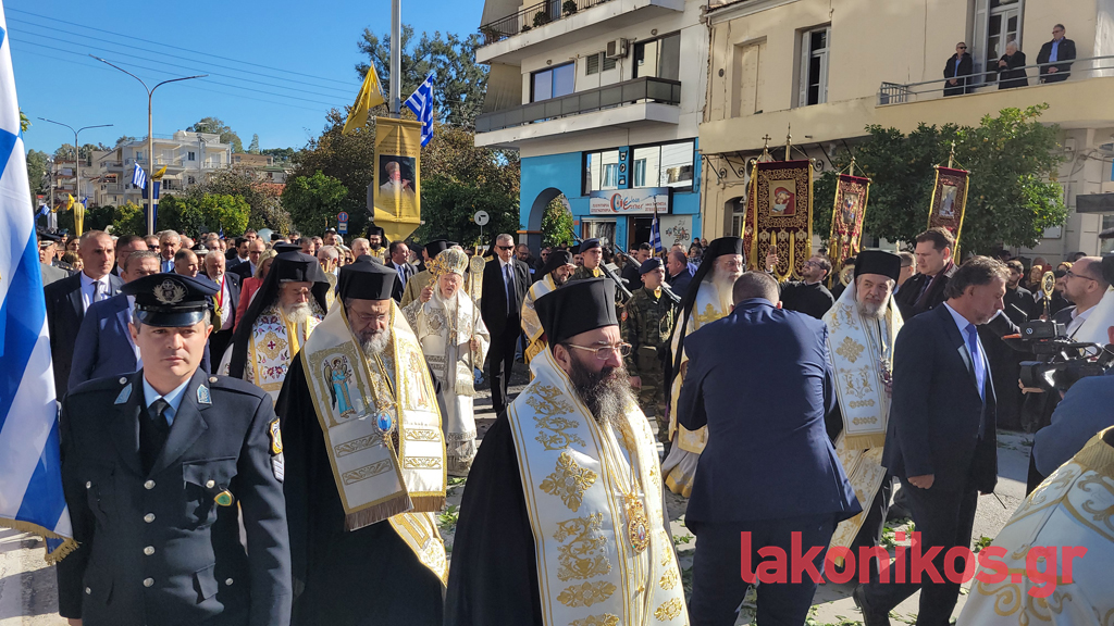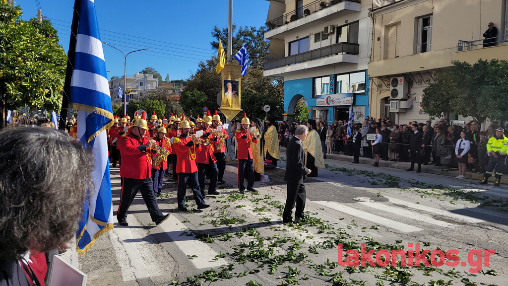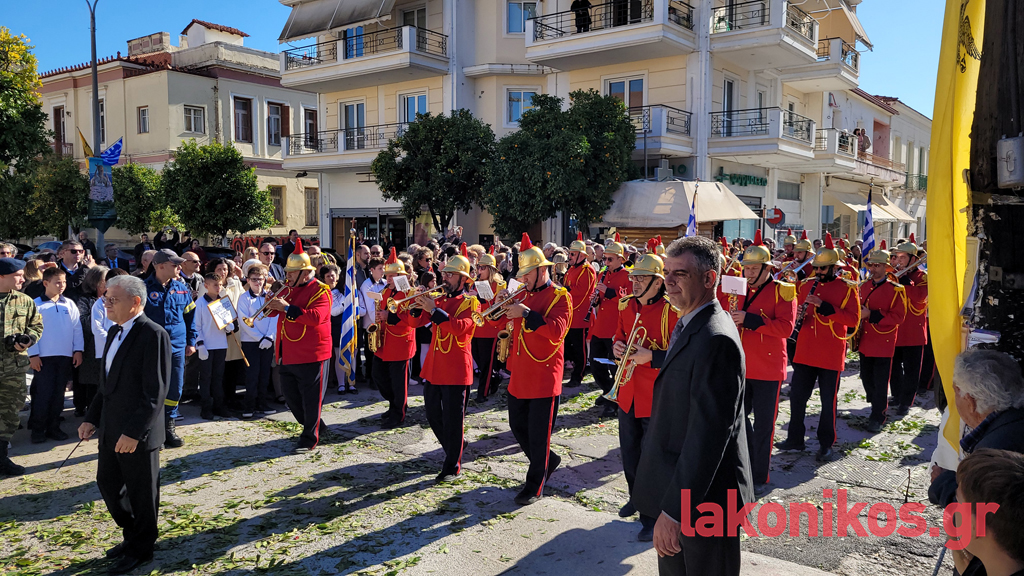 Κατά τον εορτασμό παρέστησαν, μεταξύ άλλων, η υφυπουργός Παιδείας, Θρησκευμάτων & Αθλητισμού, Ζέττα Μακρή, ως εκπρόσωπος του προέδρου της ελληνικής κυβέρνησης, οι τρεις βουλευτές Λακωνίας και βουλευτές όμορων νομών, ο περιφερειάρχης Πελοποννήσου, Δημήτρης Πτωχός, οι αντιπεριφερειάρχες Θοδωρής Βερούτης, Σπύρος Τζινιέρης και Θάνος Μιχελόγγονας και άλλοι, δήμαρχοι της Λακωνίας και γειτονικών περιοχών. Ακόμα, ο διοικητής ΔΙΚΕ Πελοποννήσου, Υποστράτηγος Απόστολος Τσουλουβής, ο Αστυνομικός Διευθυντής Λακωνίας, Βασίλειος Τσιγαρίδης, εκπρόσωποι των λοιπών Σωμάτων Ασφαλείας, μέλη της Αυτοδιοίκησης Α΄ και Β΄ Βαθμού, στελέχη τού Δικαστικού κλάδου, εκπρόσωποι όλων των βαθμίδων τής Εκπαίδευσης, φορέων και συλλόγων.