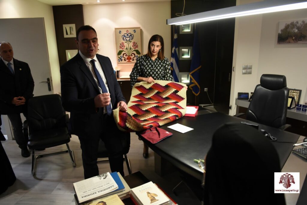 Το απόγευμα της Τρίτης 26 Νοεμβρίου, αμέσως μετά την τελετή αφής τής ιερής κανδήλας στον περικαλλή ναό που κοσμεί πλέον την περιοχή μας, ο κκ Βαρθολομαίος μετέβη στο παρακείμενο Διοικητήριο Λακωνίας. Αρχικά, ο Προκαθήμενος της Ορθοδοξίας είχε μία εθιμοτυπική συνάντηση με τον αντιπεριφερειάρχη Λακωνίας, Θεόδωρο Βερούτη, στο γραφείο του, κατά τη διάρκεια της οποίας αντηλλάγησαν δώρα υψηλού συμβολισμού. Μεταξύ αυτών και ένα γερακίτικο παραδοσιακό υφαντό. Στη συνάντηση παρευρέθηκαν ο σεβασμιώτατος Μητροπολίτης Μονεμβασίας και Σπάρτης κ. Ευστάθιος και ο δήμαρχος Σπάρτης, Μιχάλης Βακαλόπουλος.
