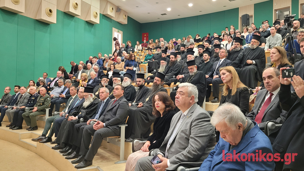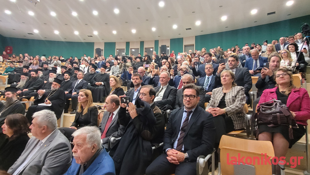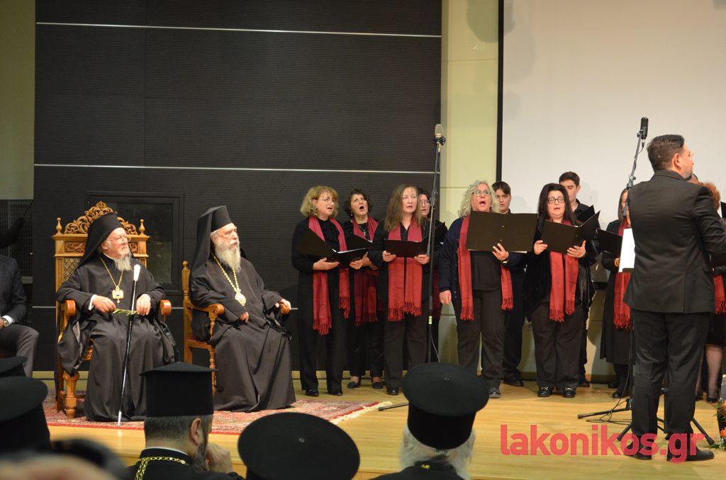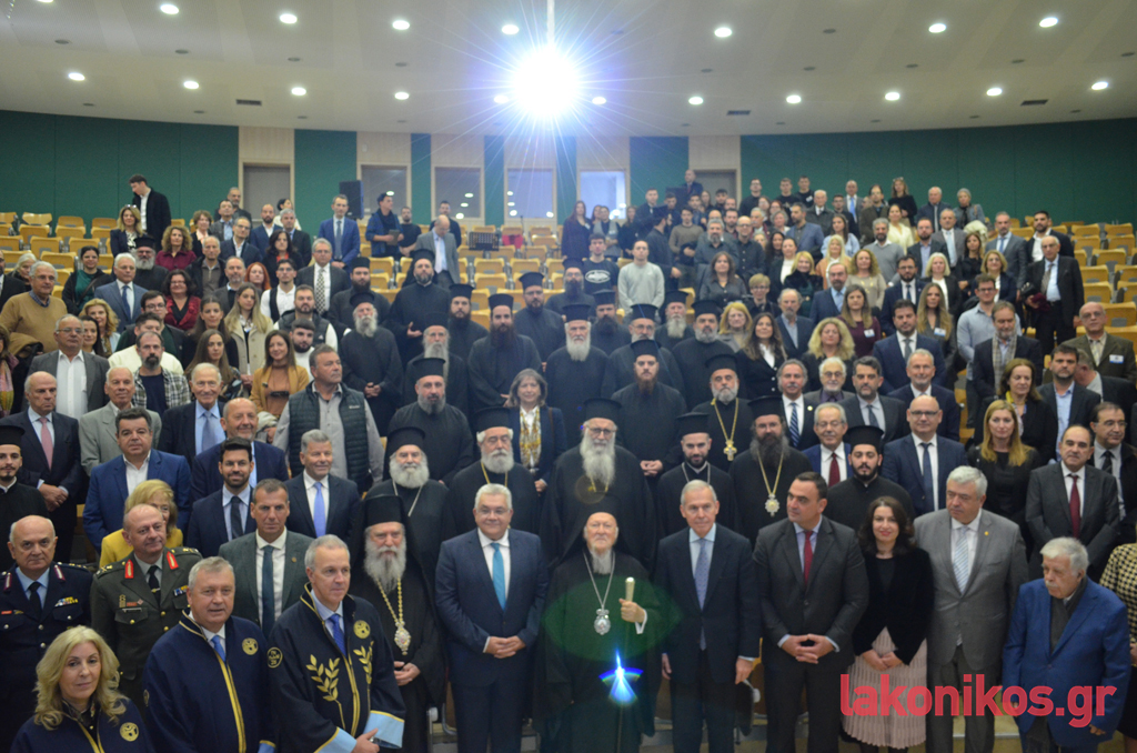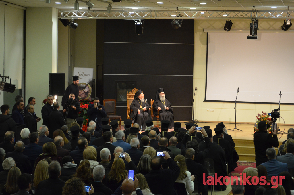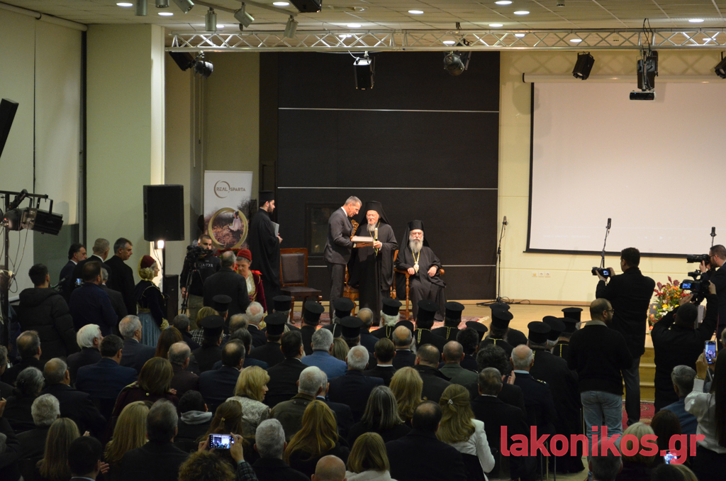 Εν συνεχεία, στην ασφυκτικά γεμάτη αίθουσα «Λακώνων ποιητών Γιάννη Ρίτσου & Νικηφόρου Βρεττάκου», έλαβε χώρα η τελετή ανακήρυξης του Οικουμενικού Πατριάρχη σε Επίτιμο Δημότη τού Δήμου Σπάρτης.