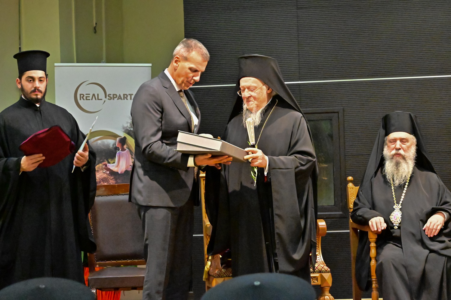 Τον χαιρετισμό ακολούθησε η εκφώνηση του επαίνου τού τιμωμένου, από τον πρόεδρο του Δημοτικού Συμβουλίου (ΔΣ) Σπάρτης, Στέφανο Βρεττάκο, ενώ στη συνέχεια προβλήθηκε βίντεο για την ευλογημένη δραστηριότητα του Οικουμενικού Πατριάρχη.