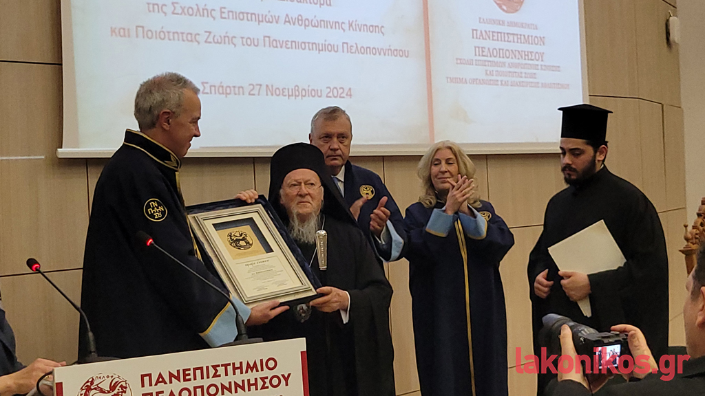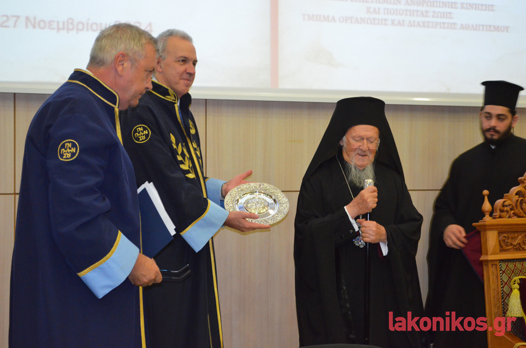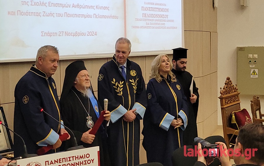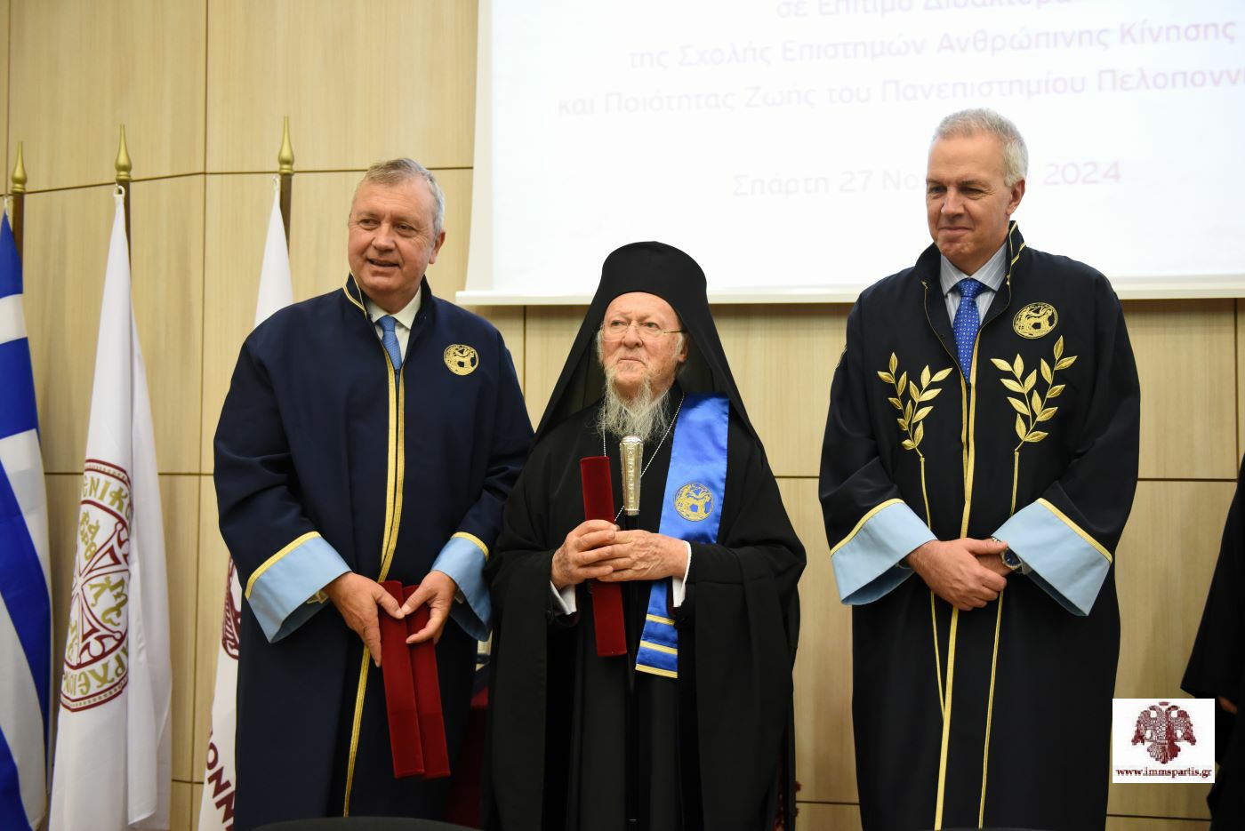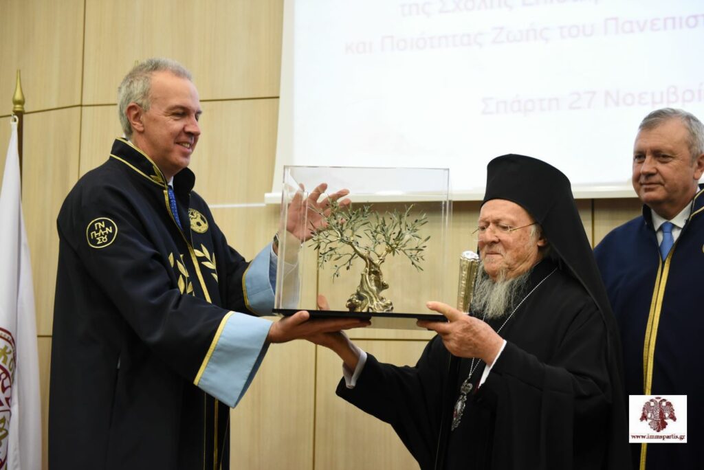 Την επόμενη ημέρα, το πρωί της Τετάρτης 27 Νοεμβρίου, στο αμφιθέατρο του Πανεπιστημίου Πελοποννήσου στη Σπάρτη, έλαβε χώρα η τελετή αναγόρευσης του Οικουμενικού Πατριάρχη σε Επίτιμο Διδάκτορα του Τμήματος Οργάνωσης και Διαχείρισης Αθλητισμού (ΤΟΔΑ) της Μονοτμηματικής Σχολής Επιστημών Ανθρώπινης Κίνησης και Ποιότητας Ζωής.