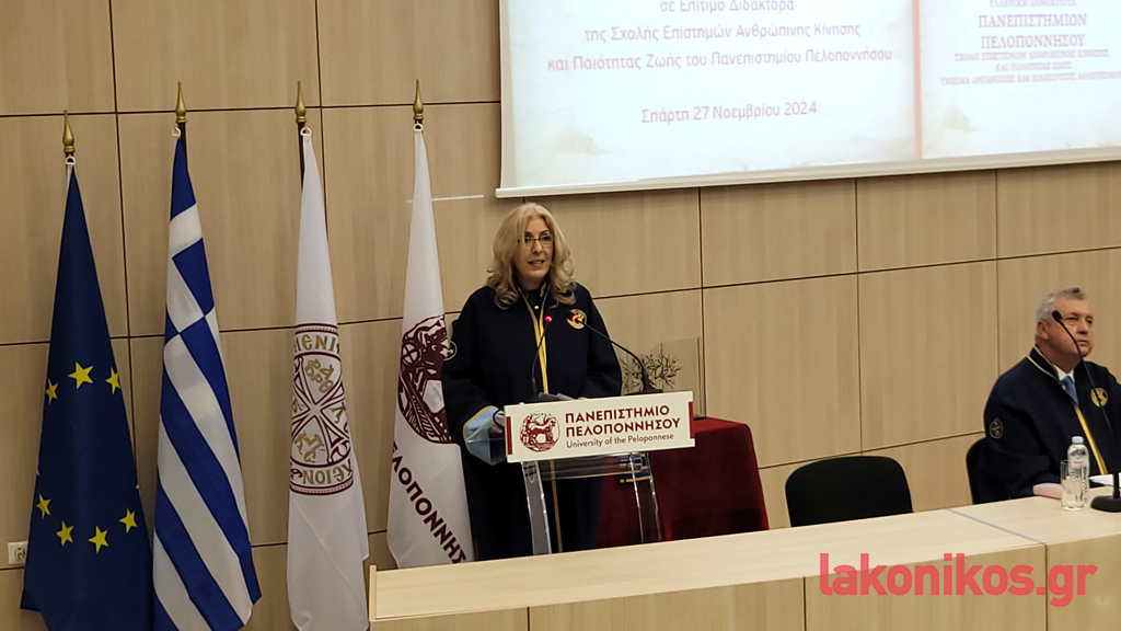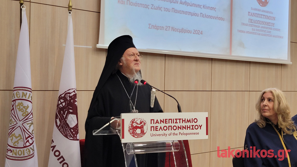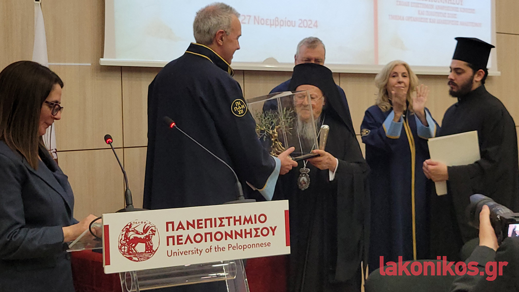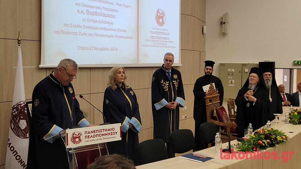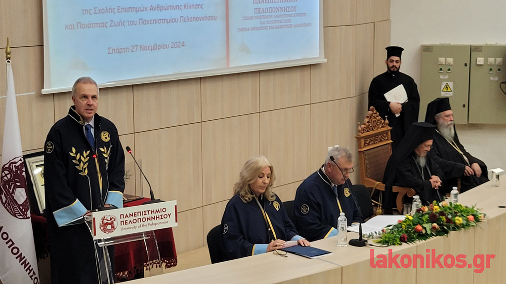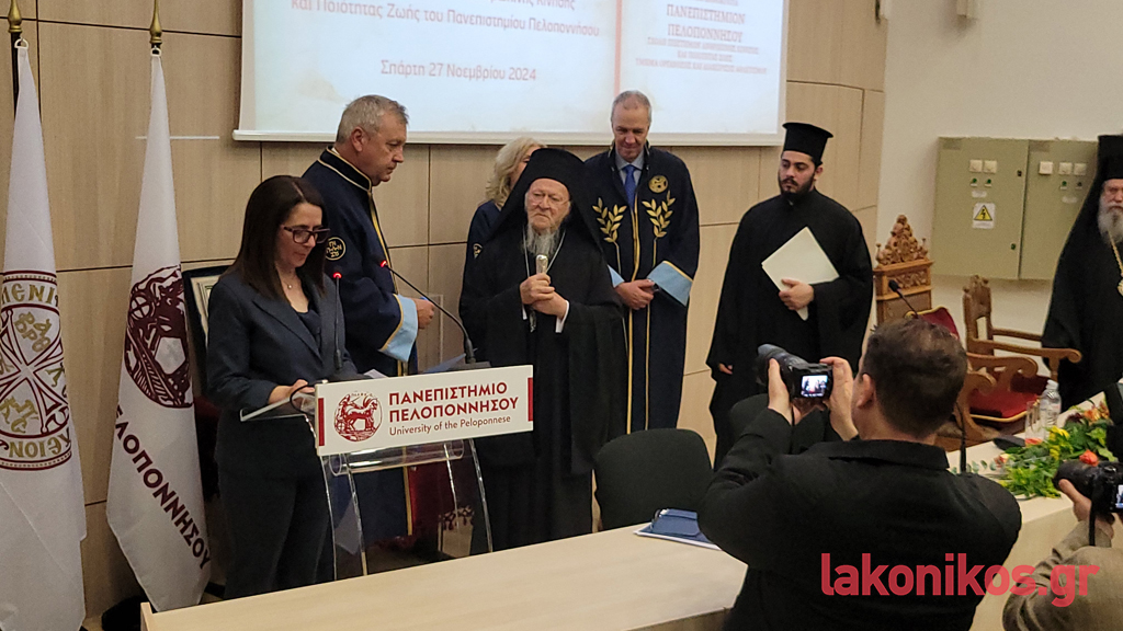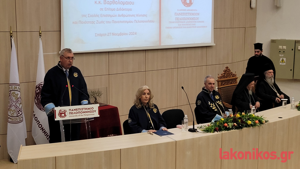 Την επόμενη ημέρα, το πρωί της Τετάρτης 27 Νοεμβρίου, στο αμφιθέατρο του Πανεπιστημίου Πελοποννήσου στη Σπάρτη, έλαβε χώρα η τελετή αναγόρευσης του Οικουμενικού Πατριάρχη σε Επίτιμο Διδάκτορα του Τμήματος Οργάνωσης και Διαχείρισης Αθλητισμού (ΤΟΔΑ) της Μονοτμηματικής Σχολής Επιστημών Ανθρώπινης Κίνησης και Ποιότητας Ζωής.