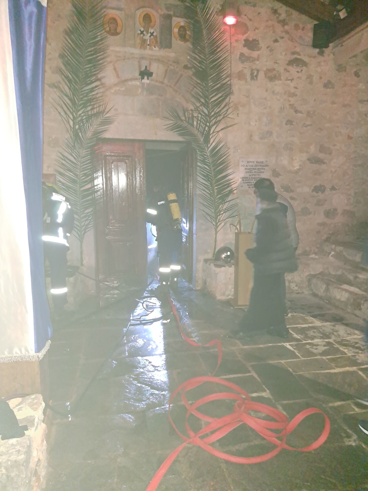 Σε πολύ λίγο χρόνο, 8 άνδρες με 4 οχήματα της ΠΥ Σπάρτης έφτασαν στον ναό και ρίχτηκαν στην κατάσβεση. Επί τόπου και ο εκτελών χρέη διοικητή της Υπηρεσίας, Νίκος Πρίμπας.Ας σημειωθεί πως οι άνδρες της πυροσβεστικής χρειάστηκαν να χρησιμοποιήσουν μάσκες οξυγόνου για να επιχειρήσουν, εξαιτίας των πυκνών καπνών!