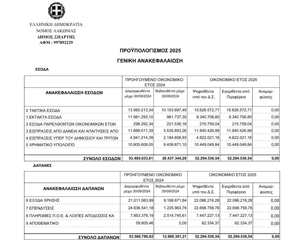 Ο δήμαρχος Σπάρτης, Μιχάλης Βακαλόπουλος, υπεραμύνθηκε του προϋπολογισμού για το οικονομικό έτος 2025. Τον χαρακτήρισε «ισοσκελισμένο και ρεαλιστικό», ενώ σημείωσε πως «στόχος της διοίκησης είναι ο συνεχής εξορθολογισμός εσόδων και δαπανών και η άμεση εκτέλεσή του για προσφορά ποιοτικών υπηρεσιών στους δημότες». Υπενθύμισε πως πέρυσι ο προϋπολογισμός ήρθε τέλη Απριλίου. Ως στόχους του προϋπολογισμού, περιέγραψε: «Να καλύψει τις ανελαστικές δαπάνες, να υποστηρίξει οικονομικά τις πολιτικές που αφορούν στην παιδεία, τον πολιτισμό, τον αθλητισμό, τις κοινωνικές δομές, τα σχολεία. Να διασφαλίσει την εκτέλεση έργων και εργασιών που αφορούν στη συντήρηση των υφιστάμενων υποδομών καθώς και τη δημιουργία νέων προς όφελος των δημοτών και της ανάπτυξης της πόλης». Επισήμανε πως «προϋπολογισμός σημαίνει πρόβλεψη, δεν σημαίνει ούτε εκτέλεση, ούτε ανάθεση, ούτε κατάτμηση».