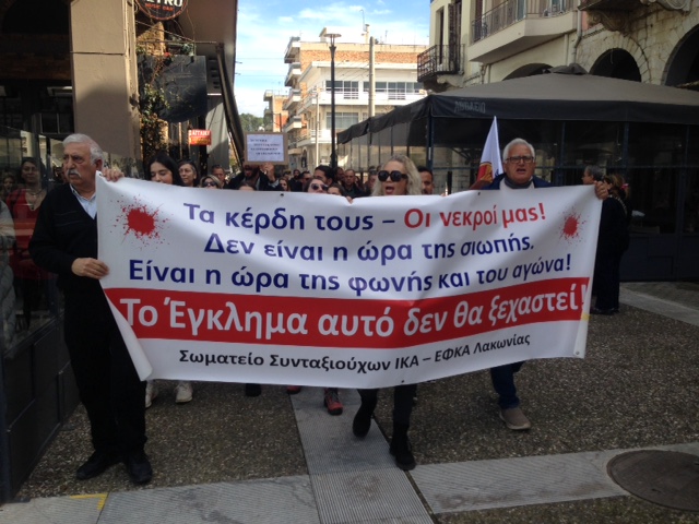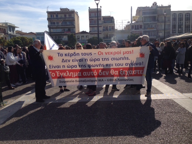 Συγκέντρωση άλλων εποχών θύμισε η λαοθάλασσα που πλημμύρισε την πλατεία της Σπάρτης. Άνθρωποι όλων των κοινωνικών τάξεων, μαθητές, οικογένειες, μητέρες με τα παιδιά τους σε καρότσια, πολίτες χωρίς εμφανή πολιτική ένταξη, χωρίς κομματικό πρόσημο, έφηβοι, νεαροί και ηλικιωμένοι, ενταγμένοι μα κυρίως ανένταχτοι, έδωσαν το «παρών» στο κέντρο της λακωνικής πρωτεύουσας, ζητώντας δικαίωση για τις ψυχές των νεκρών. Βουβός πόνος, σιωπηλή διαμαρτυρία. Το κάλεσμα του συλλόγου των γονέων των θυμάτων είχε μεταφέρει η ΑΔΕΔΥ Λακωνίας, ενώ οι συνταξιούχοι ΙΚΑ-ΕΦΚΑ Λακωνίας, ανταποκρίθηκαν επωνύμως.