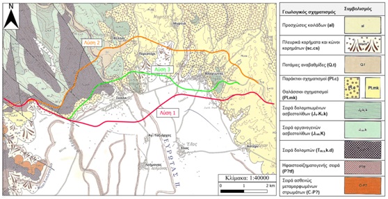 - Δάνεια και περίσσεια υλικών: Το ισοζύγιο χωματισμών (επιχώματα μείον ορύγματα) για τη λύση 2 είναι 710.000 μ³, για τη λύση 1 είναι 925.000 μ³ και για τη λύση 3 είναι 1.000.000 μ³.