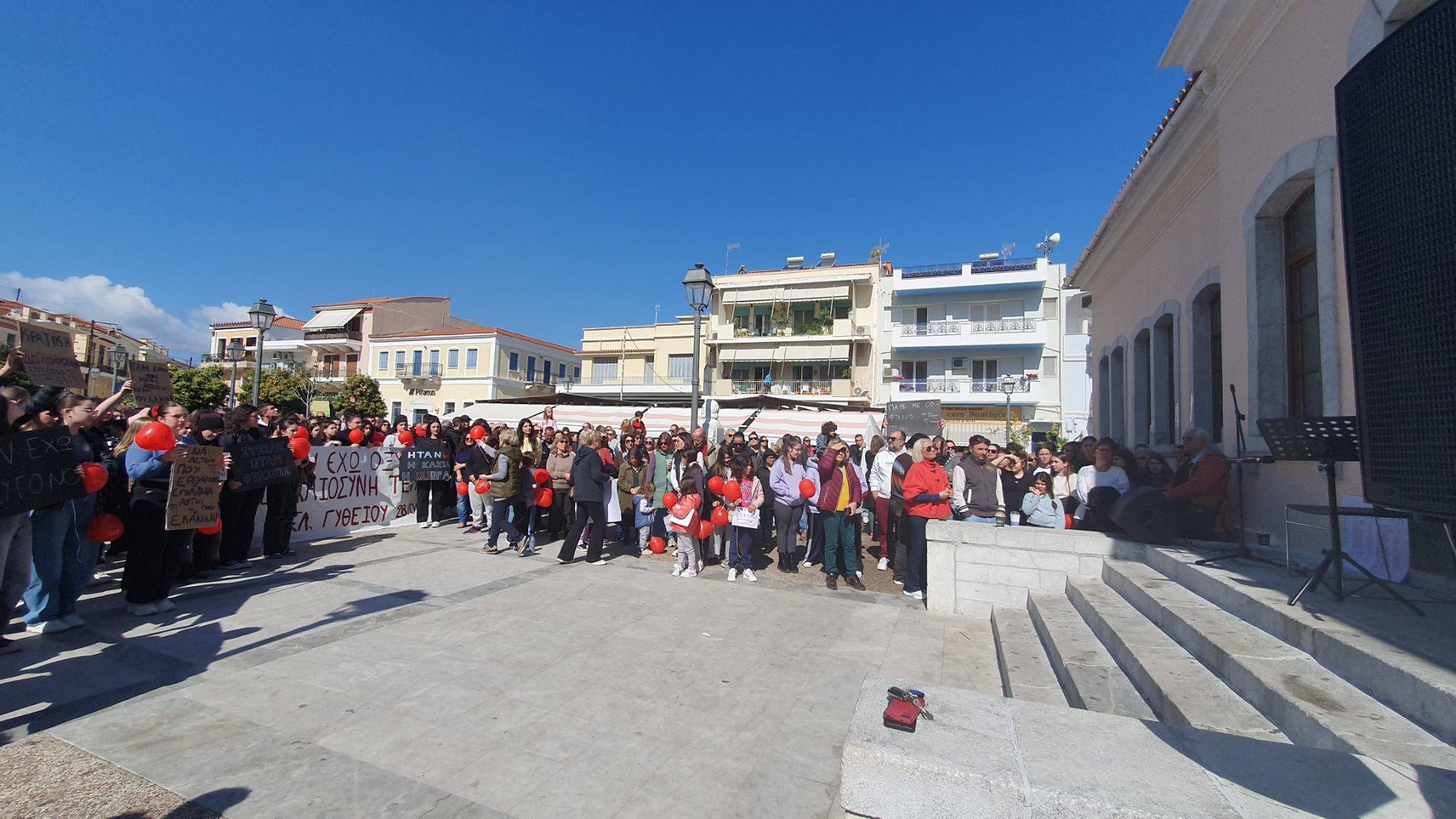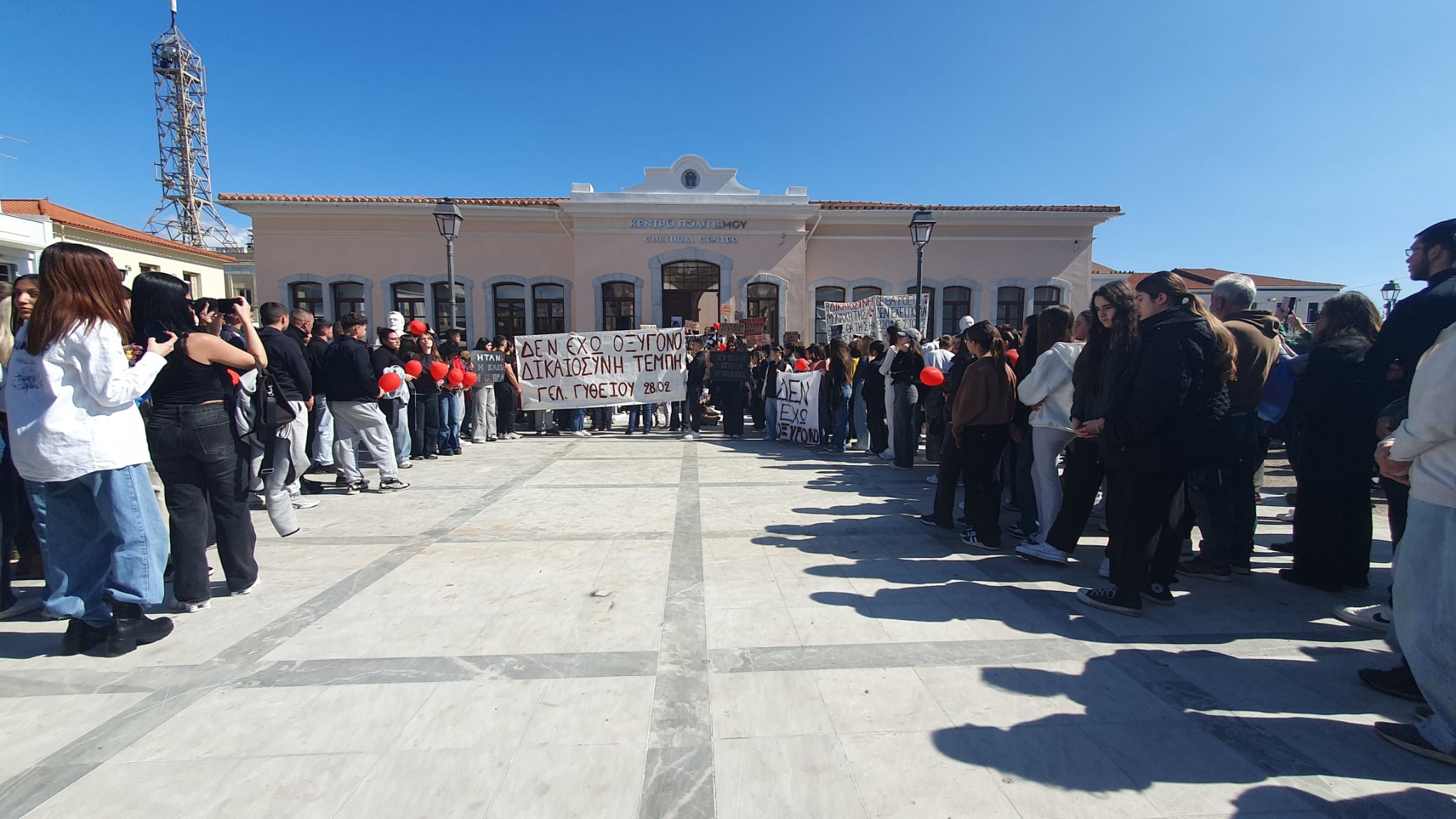 Στο Γύθειο, μικροί και μεγάλοι έλαβαν μέρος στη συγκέντρωση που έγινε στην πλατεία Παρθεναγωγείου. Η «ψυχή» της συγκέντρωσης ήταν κυρίως μαθητές σχολείων της περιοχής. Οι απαγγελίες ποιημάτων και τα τραγούδια κυριάρχησαν, ενώ οι καθηγητές και οι γονείς βρίσκονταν στο πλευρό των παιδιών τους με πανό στα χεριά. Ιδιαίτερα φορτισμένη ήταν η στιγμή που εκφωνήθηκαν τα ονόματα των 57 θυμάτων, ενώ η συγκέντρωση έκλεισε με τραγούδια.