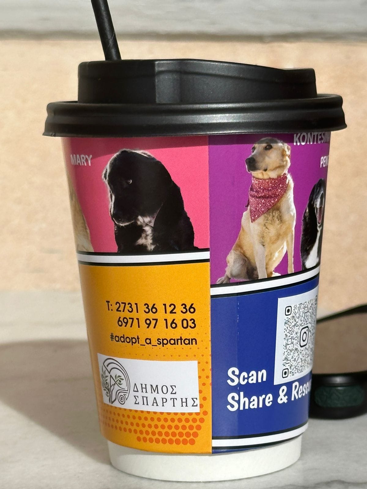 Σχεδίασε και παρήγαγε χάρτινα κύπελλα, τα οποία φέρουν φωτογραφίες των συμπαθών τετράποδων που φιλοξενούνται στο Καταφύγιο Αγίας Κυριακής του Δήμου Σπάρτης, συνοδευόμενα από έναν ψηφιακό κωδικό (QR code). Μέσω αυτού, κατευθύνονται σε ειδική σελίδα, όπου οι ενδιαφερόμενοι μπορούν να μάθουν περισσότερα για τα ζωάκια και να συνεισφέρουν στην υιοθεσία τους. Αξιοσημείωτο ότι τα ποτηράκια διατίθενται δωρεάν, προκειμένου να ενισχύσουν τη δράση και τη διάδοση του μηνύματος της αναδοχής.