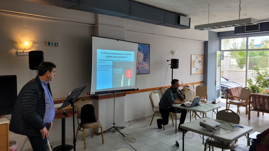 Οι μέθοδοι και πρακτικές που χρησιμοποιούν οι επιτήδειοι για να εξαπατήσουν ανυποψίαστους πολίτες και να τους αποσπάσουν χρηματικά ποσά, μέσω τηλεφωνικών κλήσεων, βρέθηκαν στο επίκεντρο της ενημερωτικής εκδήλωσης, που διοργάνωσαν την Τρίτη (18/3) στο ΚΑΠΗ Σπάρτης, ο Δήμος Σπάρτης και το Τμήμα Δίωξης και Εξιχνίασης Εγκλημάτων Σπάρτης της Διεύθυνσης Αστυνομίας Λακωνίας.