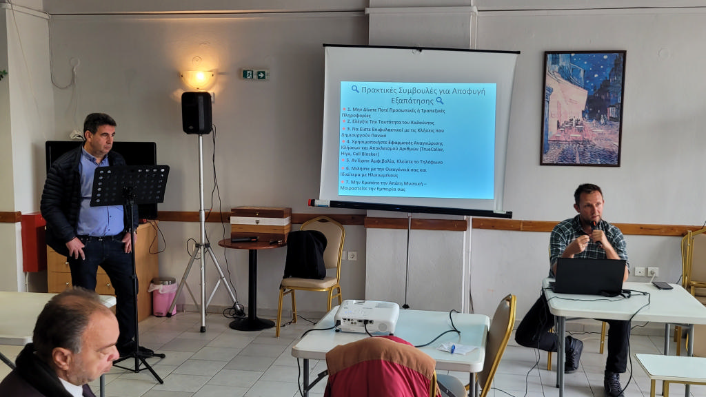 Ο διοικητής του Τμήματος Δίωξης και Εξιχνίασης Εγκλημάτων Σπάρτης, Αστυνόμος Α΄, κ. Παναγιώτης Λυμπέρης και ο Ανθυπαστυνόμος, κ. Νικόλαος Λεβετζώνης, παρείχαν λεπτομερή ενημέρωση για τους τρόπους και τις νέες τεχνικές τηλεφωνικής εξαπάτησης, χρησιμοποιώντας και ηχητικά παραδείγματα από καταγεγραμμένες συνομιλίες τηλεφωνικής απάτης.