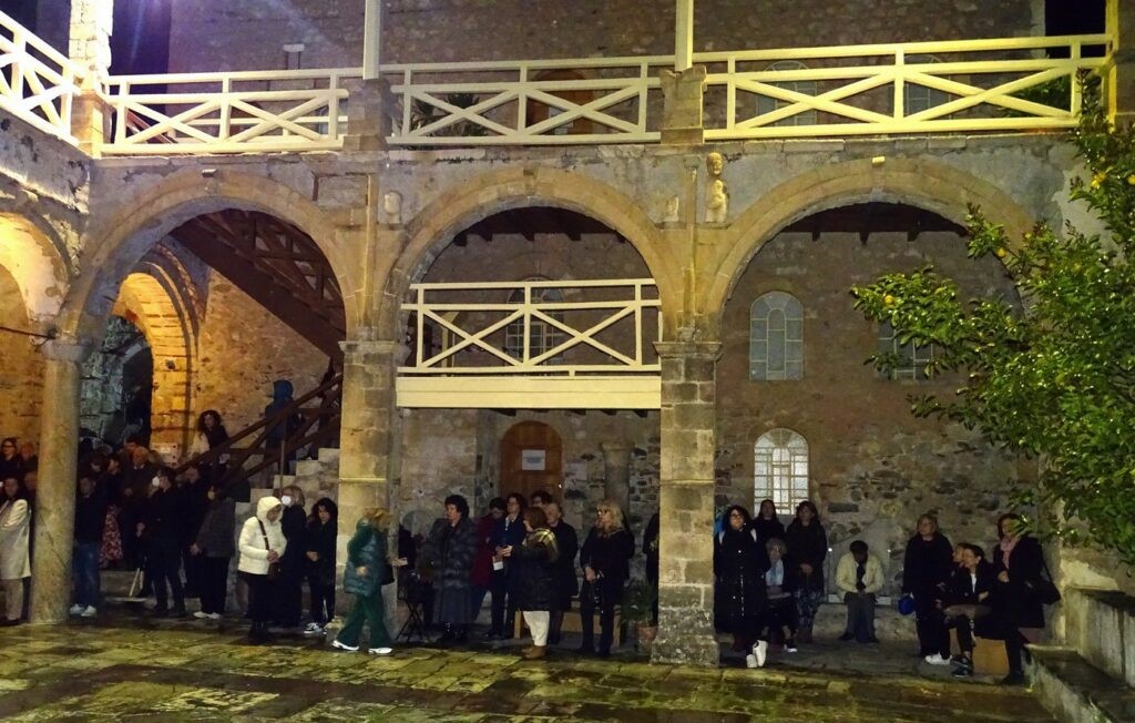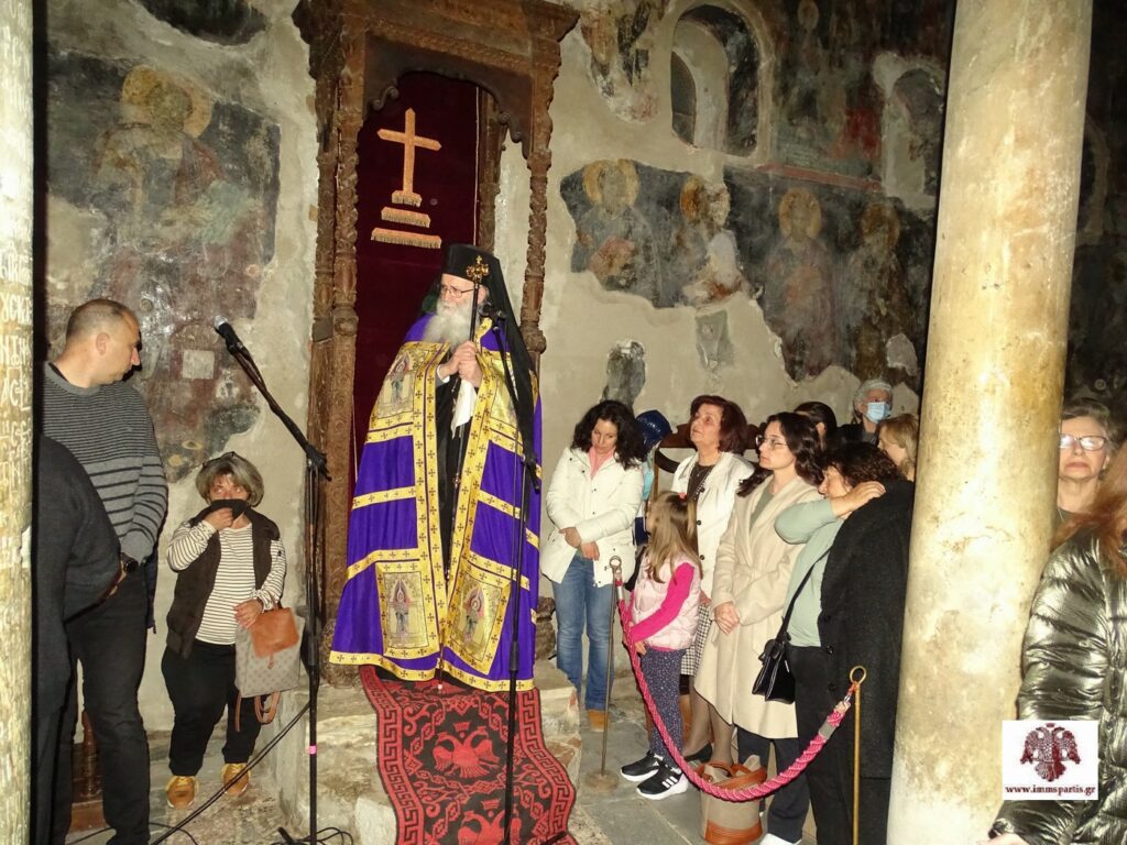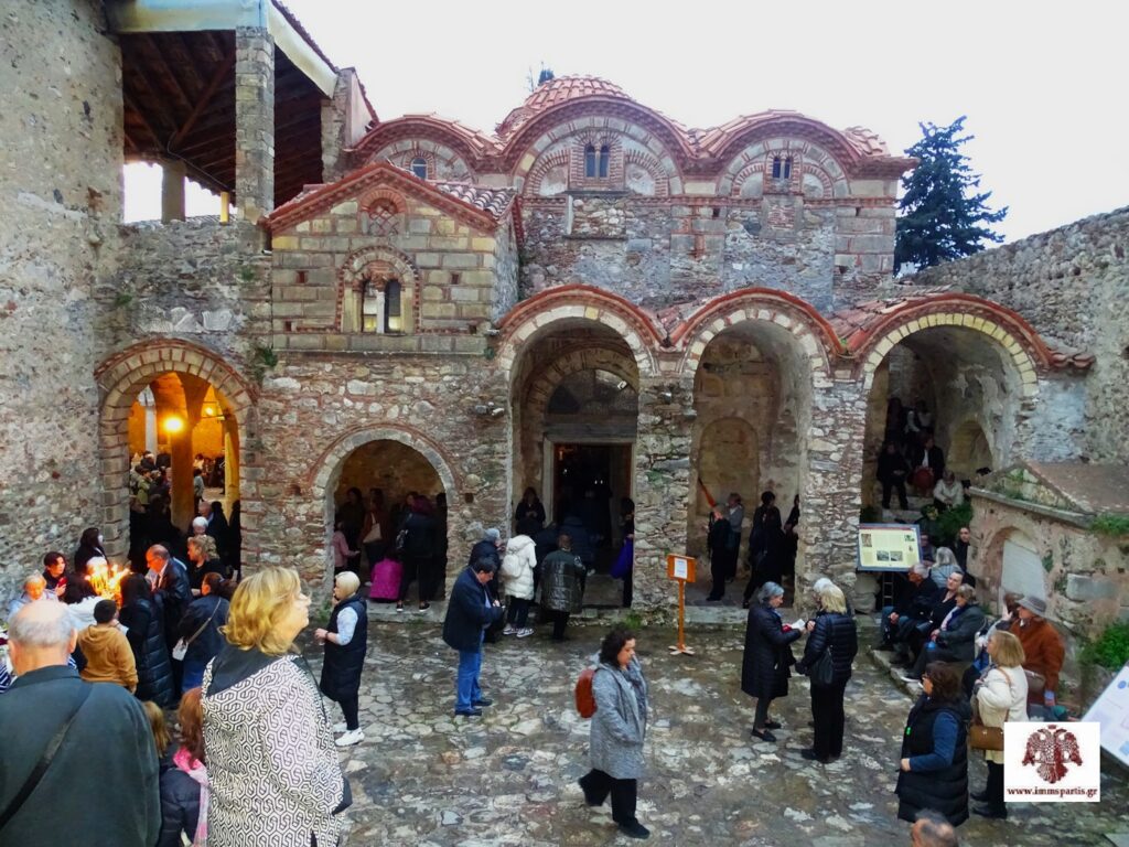 Κατά τη διάρκεια της εσπερινής λατρευτικής σύναξης, ο σεβασμιώτατος κ. Ευστάθιος καλωσόρισε τους πολυάριθμους ευλαβείς προσκυνητές στον ιστορικό Μυστρά, που «είναι αγιασμένος με τα αίματα των μαρτύρων της Πίστεως και της Πατρίδας μας και είναι ποτισμένος με τα δάκρυα ή της μετανοίας ή της αγωνίας πατέρων και αδελφών μας που έζησαν εκεί».