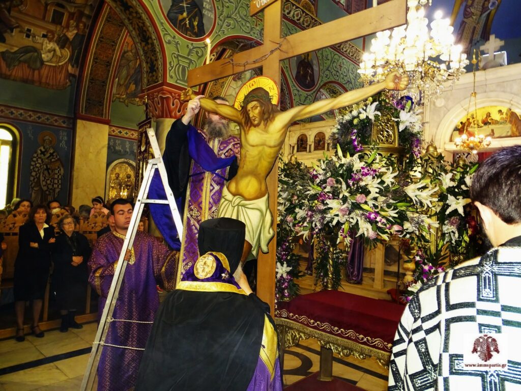 Σε έντονα συγκινησιακό κλίμα τελέσθηκαν, το πρωί της Μ. Παρασκευής (18/5) στον Ιερό Ναό Οσίου Νίκωνος Σπάρτης, η ακολουθία των Μεγάλων Ωρών και ο Εσπερινός της Αποκαθηλώσεως, χοροστατούντος του σεβασμιωτάτου Μητροπολίτη Μονεμβασίας και Σπάρτης κ. Ευσταθίου. Πολλοί ήταν οι πιστοί κάθε ηλικίας, οι οποίοι προσήλθαν στον ναό, για να βιώσουν την κορύφωση του Θείου Πάθους προσκυνώντας αρχικά τον Εσταυρωμένο και στη συνέχεια, μετά την Αποκαθήλωση, τον λαμπρά στολισμένο Επιτάφιο του Ιησού Χριστού, εναποθέτοντας με ευλάβεια την προσευχή και τα αιτήματά τους.