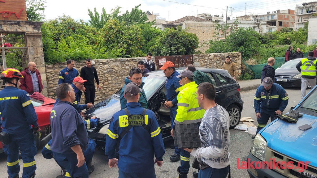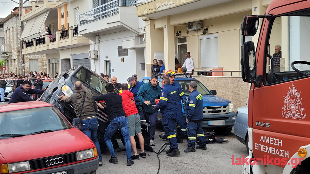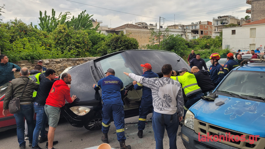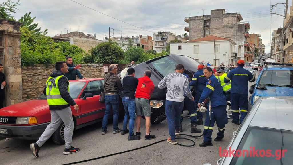 Ένα πρωτοφανές τροχαίο σημειώθηκε λίγο μετά τη 1 το μεσημέρι της Τρίτης (29/4) στη Σπάρτη. Επί της οδού Άγιδος, στο τμήμα μεταξύ Βρασίδου και Θερμοπυλών, πλησίον γραφείων ΔΕΔΔΗΕ, αυτοκίνητο στο οποίο επέβαιναν 2 γυναίκες, εξετράπη της πορείας του, προσέκρουσε σε σταθμευμένο όχημα κι, εκτός ελέγχου, ανετράπη σε πλάγια θέση, αφού «καβάλησε» κυριολεκτικά σε άλλο παρκαρισμένο ΙΧ. Οι δύο επιβαίνουσες εγκλωβίστηκαν μέσα στο όχημα και χρειάστηκε η επέμβαση των Αρχών για τον απεγκλωβισμό τους. Επί τόπου έσπευσαν κι επιχείρησαν ισχυρές δυνάμεις της Αστυνομίας, της Πυροσβεστικής, της Πολιτικής Προστασίας Δ. Σπάρτης και ασθενοφόρα του ΕΚΑΒ.