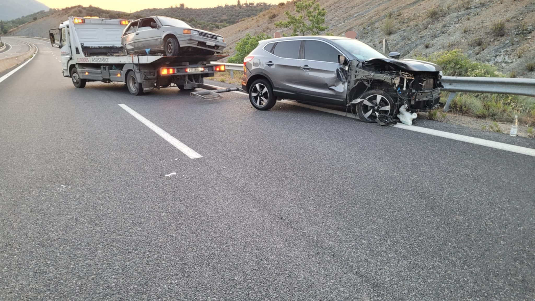 Αμφότερα τα αυτοκίνητα υπέστησαν εκτεταμένες υλικές ζημιές, ενώ ειδικά το όχημα του 71χρονου τραυματία μετετράπη σε άμορφη μάζα σιδερικών. Χαρακτηριστικό της σφοδρότητας ήταν ότι τα εμπλεκόμενα ΙΧ κατέληξαν ακινητοποιημένα σε απόσταση άνω των 20 μέτρων μεταξύ τους, το ένα στη μέση και το άλλο στην άκρη του οδοστρώματος, πάνω σε προστατευτικές μπάρες.