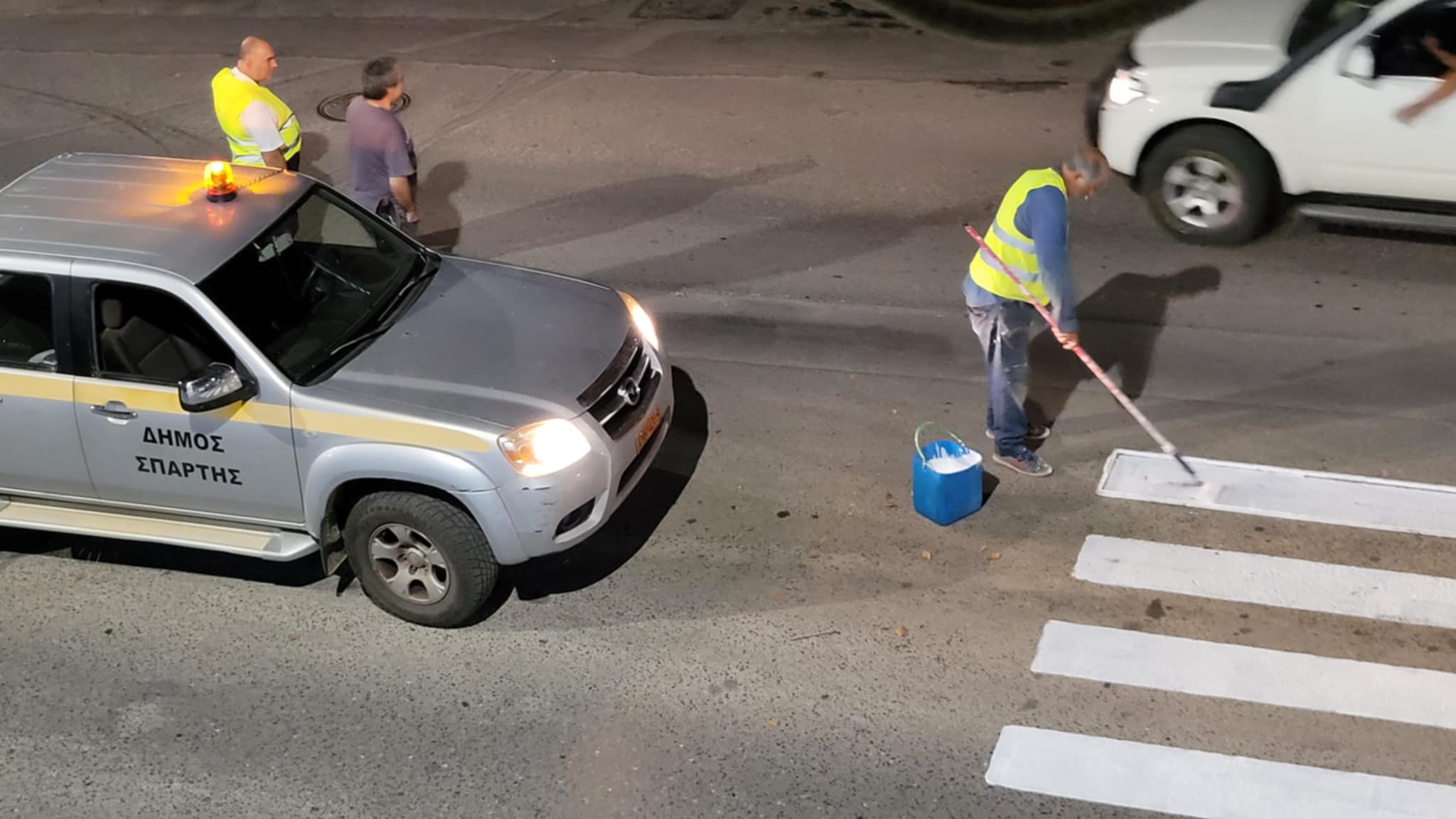 Την προηγούμενη εβδομάδα, στις… ανατολικές γειτονιές της Όθωνος Αμαλίας και συγκεκριμένα στο ύψος της συμβολής με τη Χαμαρέτου, «έσπασε» η ησυχία της νύχτας. Φωνές και ήχοι από οχήματα δήλωναν πως κάτι… τρέχει. «Θα ξεκινήσουμε από εκεί και θα το πάμε έτσι…», ακούστηκε να λέει ο Κώστας Χάρακας, ο ακαταπόνητος εργάτης του δήμου, γνωστός για το μεράκι και την αφοσίωσή του. Μαζί με τους συνεργάτες του, κατέφτασαν για μια παρέμβαση μικρής κλίμακας, αλλά σημαντική και αναγκαία: Τη διαγράμμιση για δημιουργία διαβάσεων σε 2 σημεία του δρόμου –για πρώτη φορά στα χρονικά στο συγκεκριμένο τμήμα. Μία κάθετα στην Όθωνος Αμαλίας και μία διαγώνια, κατά πλάτος της Αναπαύσεως και της Χαμαρέτου.