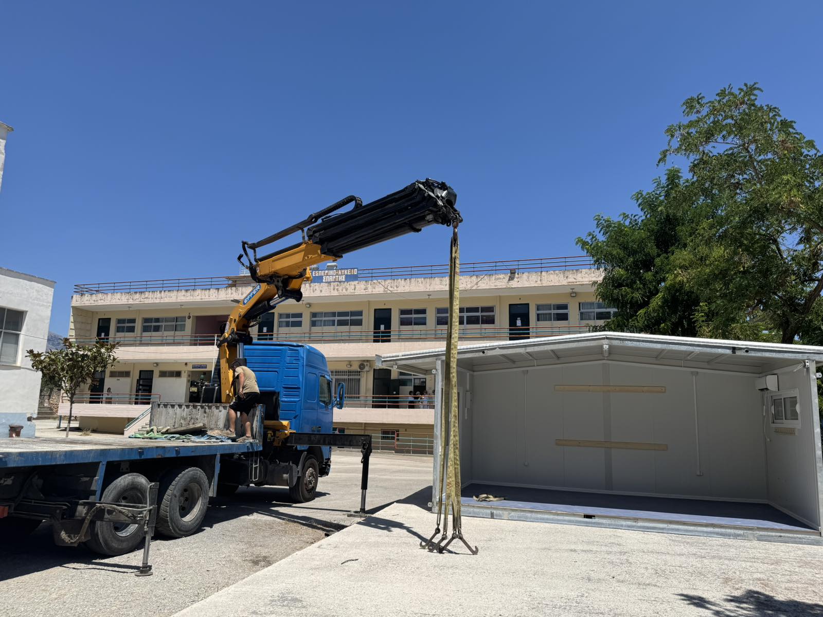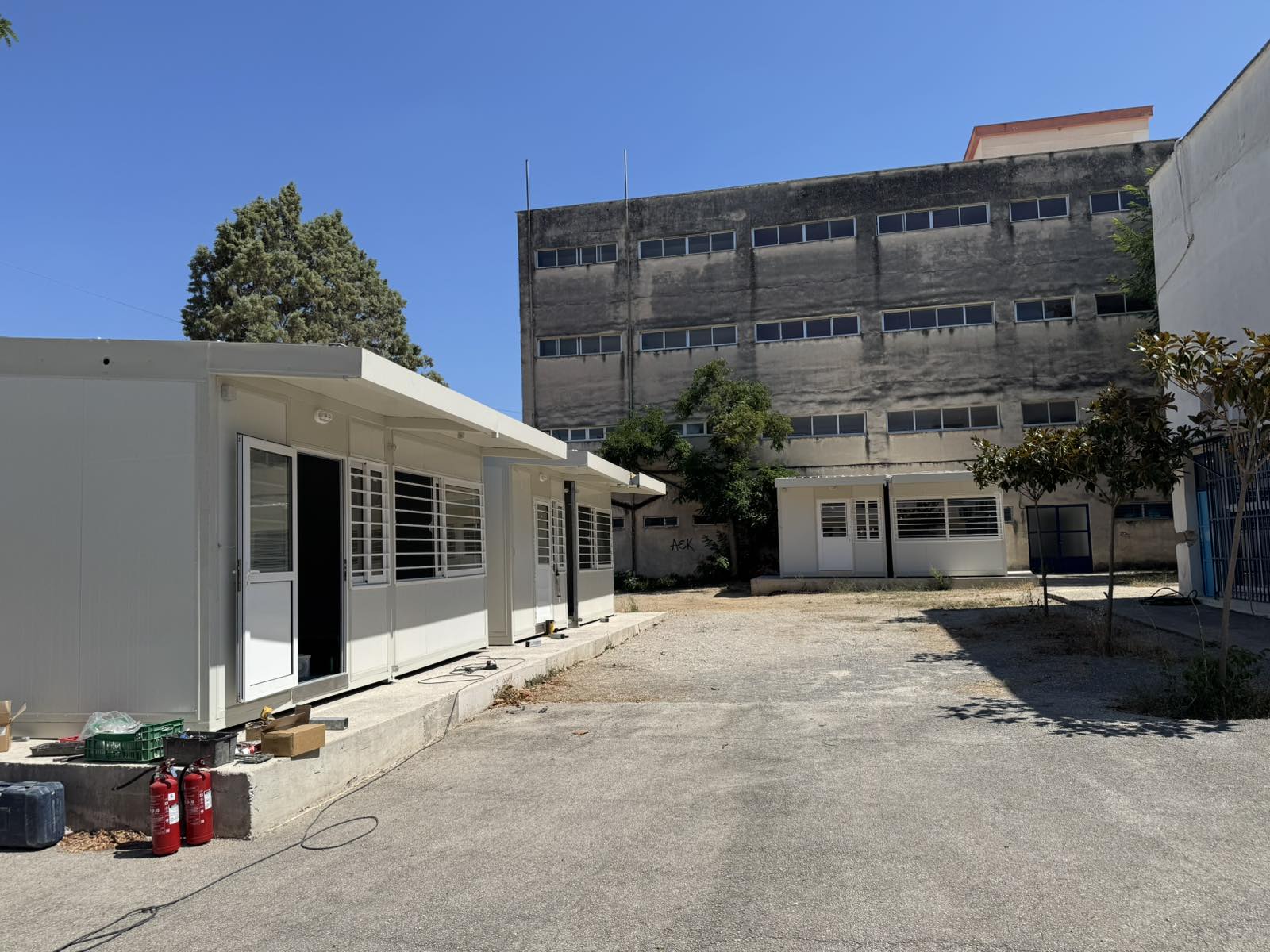 Πιο συγκεκριμένα, ολοκληρώθηκε η τοποθέτηση τριών αιθουσών στον προαύλιο χώρο του Εσπερινού Λυκείου Σπάρτης, όπου συστεγάζεται πλέον και το 1ο Γυμνάσιο.