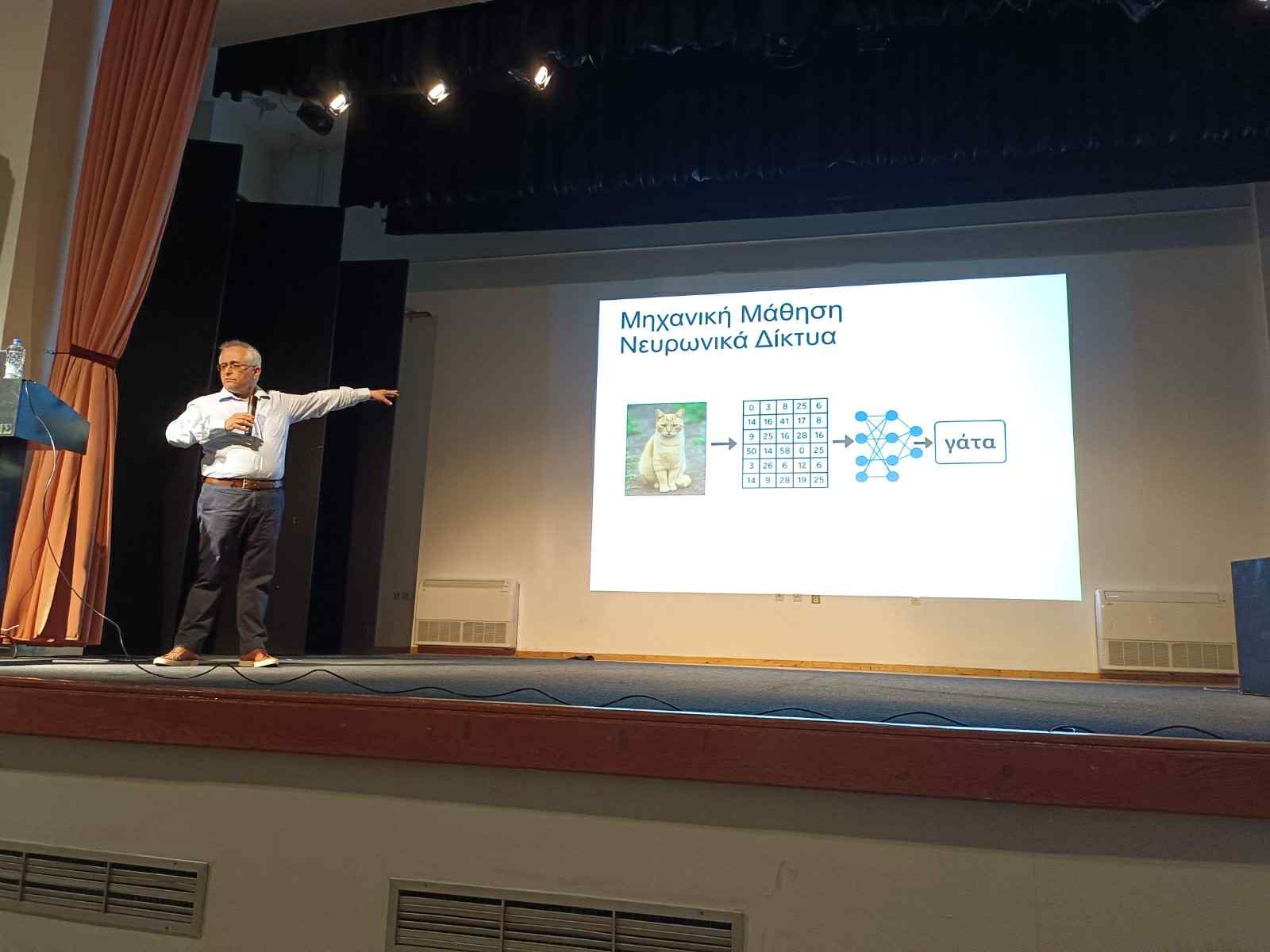 Ενδιαφέρον προκάλεσε και το κομμάτι της ομιλίας που αφορούσε τις σύγχρονες εφαρμογές των μαθηματικών στην τεχνητή νοημοσύνη και ειδικά στα νευρωνικά δίκτυα, μέσα από το παράδειγμα της μηχανικής μάθησης και της αναγνώρισης εικόνων -μια πρακτική επίδειξη της καθημερινής παρουσίας των μαθηματικών στη ζωή μας.