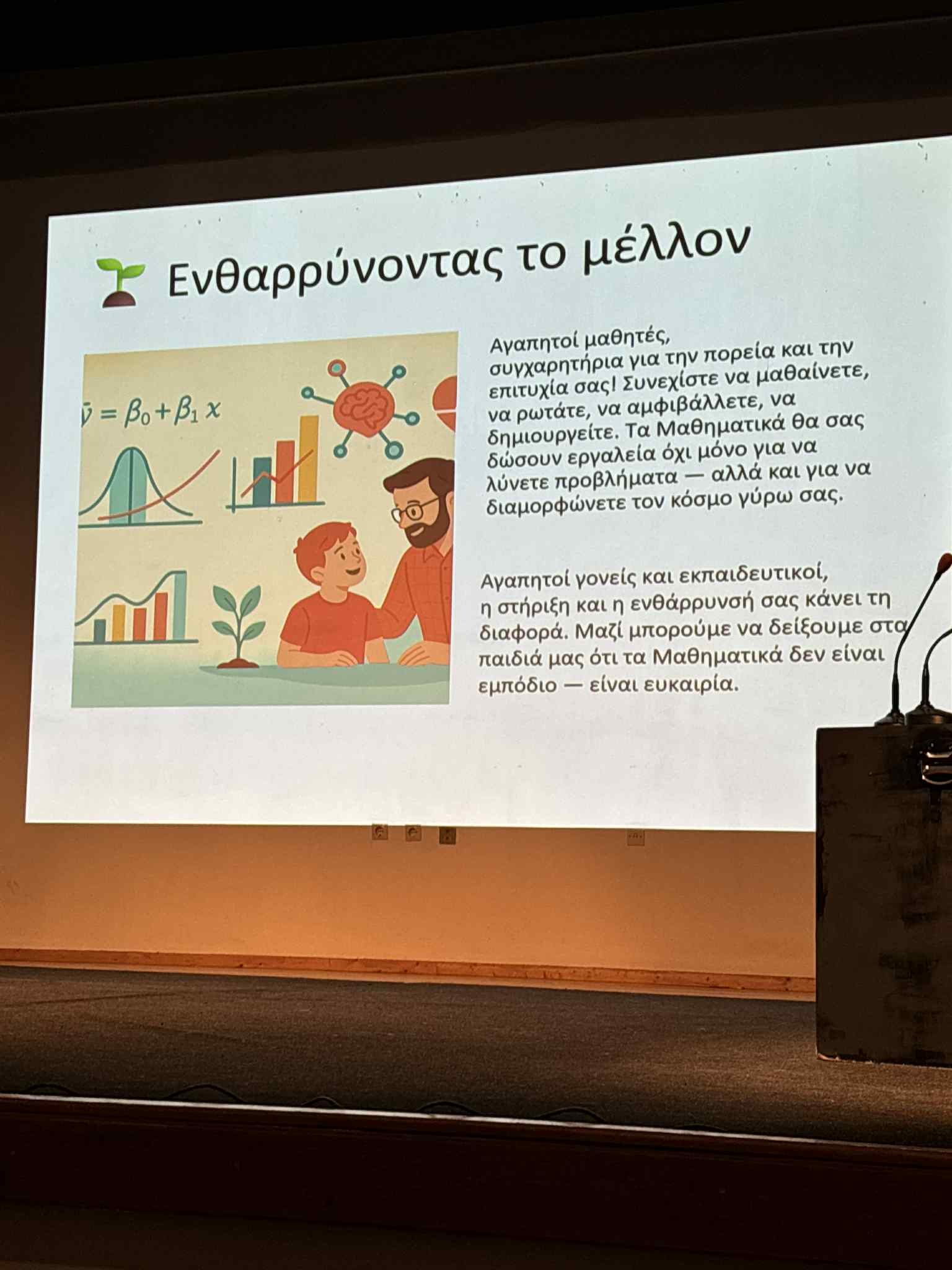 Η ομιλία έκλεισε με ένα αισιόδοξο μήνυμα προς γονείς και εκπαιδευτικούς: να στηρίζουν τα παιδιά τους, δείχνοντάς τους πως τα μαθηματικά δεν είναι τροχοπέδη αλλά αφετηρία για δημιουργία και εξέλιξη.