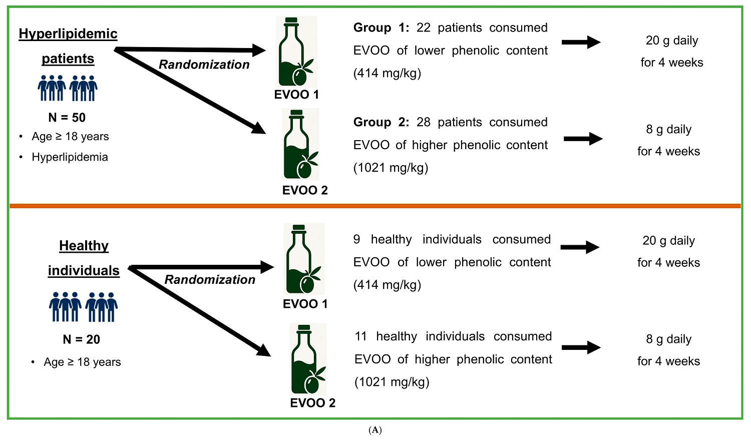 Στη μελέτη συμμετείχαν 50 ασθενείς με υπερλιπιδαιμία, οι οποίοι για 4 εβδομάδες έλαβαν είτε 20 γραμμάρια ημερησίως έξτρα παρθένου ελαιολάδου (EVOO) με χαμηλή περιεκτικότητα σε πολυφαινόλες, είτε 8 γραμμάρια ημερησίως EVOO με υψηλή περιεκτικότητα σε πολυφαινόλες (1021 mg/kg).