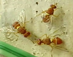 Σε ό,τι αφορά στα συμπτώματα στους καρπούς, τα νύγματα ωοτοκίας είναι συχνά ορατά στη φλούδα των προσβεβλημένων καρπών. Σε γενικές γραμμές, τα συμπτώματα της προσβολής από το έντομο είναι παρόμοια με αυτά που προκαλεί η μύγα της Μεσογείου.