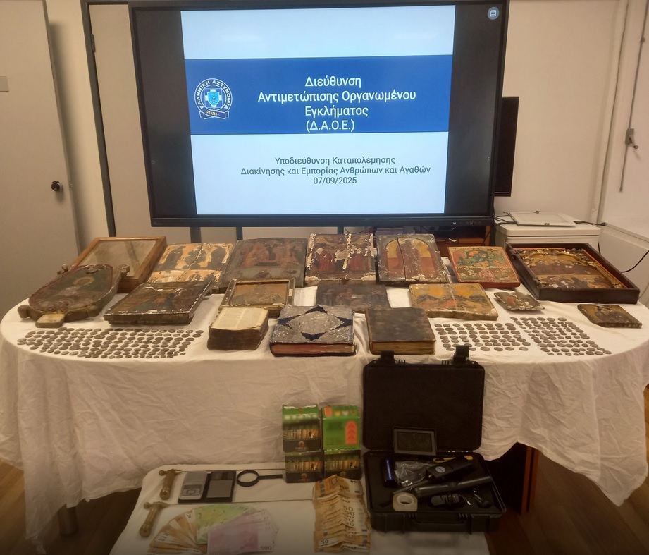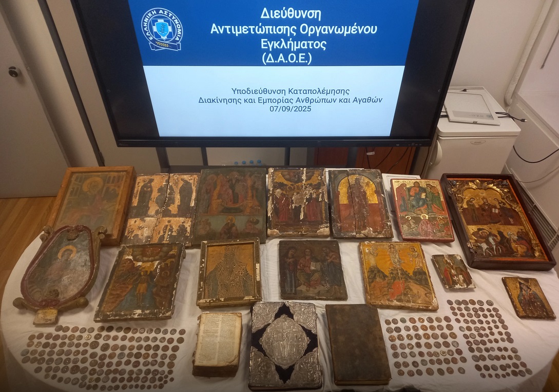 Συγκεκριμένα, από την Υποδιεύθυνση Καταπολέμησης Διακίνησης και Εμπορίας Ανθρώπων και Αγαθών της Διεύθυνσης Αντιμετώπισης Οργανωμένου Εγκλήματος της ΕΛΑΣ, «εξαρθρώθηκε εγκληματική οργάνωση, τα μέλη της οποίας δραστηριοποιούνταν στην κατοχή και πώληση θρησκευτικών εικόνων και άλλων αρχαίων αντικειμένων». Για την αποδόμηση της οργάνωσης πραγματοποιήθηκε συντονισμένη αστυνομική επιχείρηση τις μεσημβρινές ώρες της Κυριακής (7/9), σε περιοχές της Πελοποννήσου, στο πλαίσιο της οποίας συνελήφθησαν συνολικά 6 μέλη της, μεταξύ των οποίων ο ηγούμενος της μονής. Σε βάρος τους σχηματίσθηκε δικογραφία -κατά περίπτωση- για εγκληματική οργάνωση, υπεξαίρεση, αποδοχή και διάθεση προϊόντων εγκλήματος, όπλα, καθώς και παραβάσεις των νομοθεσιών περί προστασίας των αρχαιοτήτων και εν γένει της Πολιτιστικής Κληρονομιάς και περί ανιχνευτών μετάλλων.