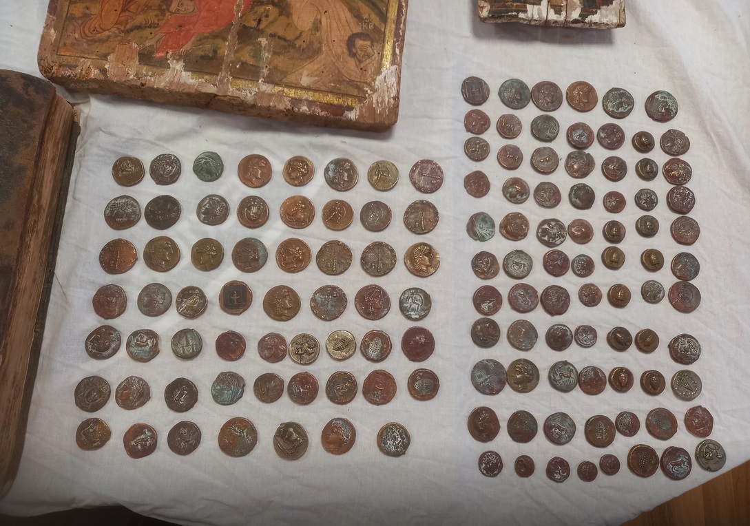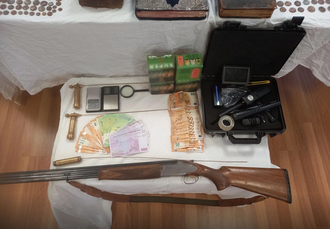 Από τις έρευνες που πραγματοποιήθηκαν σε οικίες και λοιπούς χώρους, μεταξύ άλλων, βρέθηκαν συνολικά και κατασχέθηκαν: 264 νομίσματα, 14 θρησκευτικές εικόνες, 2 Ιερά Ευαγγέλια και θρησκευτικό βιβλίο του 18ου αιώνα, 3 αρχιερατικά εγκόλπια, επαγγελματικό μηχάνημα ανίχνευσης μετάλλων, 2 κυνηγετικά όπλα, 262 κυνηγετικά φυσίγγια, 1 μαχαίρι, το ποσό των 2.810 ευρώ, 1 χρυσή λίρα, 2 ζυγαριές ακριβείας, 2 οχήματα, 7 κινητά, 1 τάμπλετ, 1 φακός και 1 μεγεθυντικός φακός, 18 φωτογραφίες που απεικονίζουν αρχαία αντικείμενα και πλήθος εγγράφων – σημειώσεων.