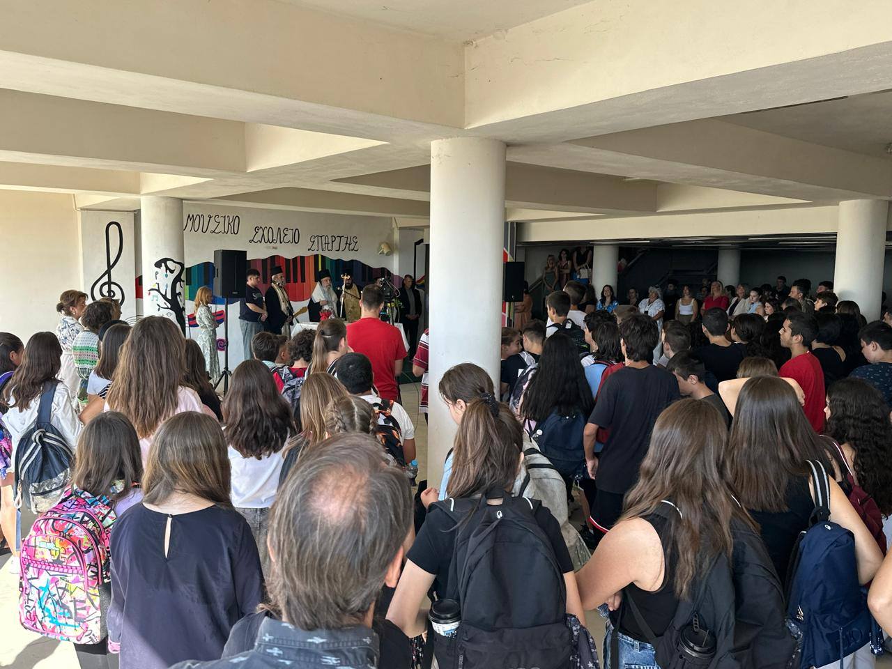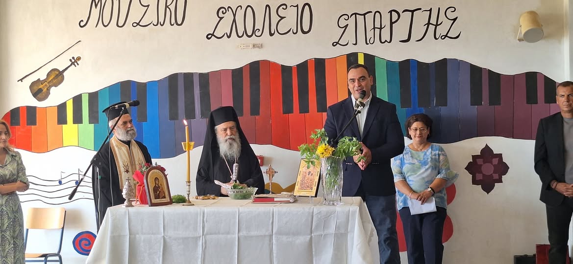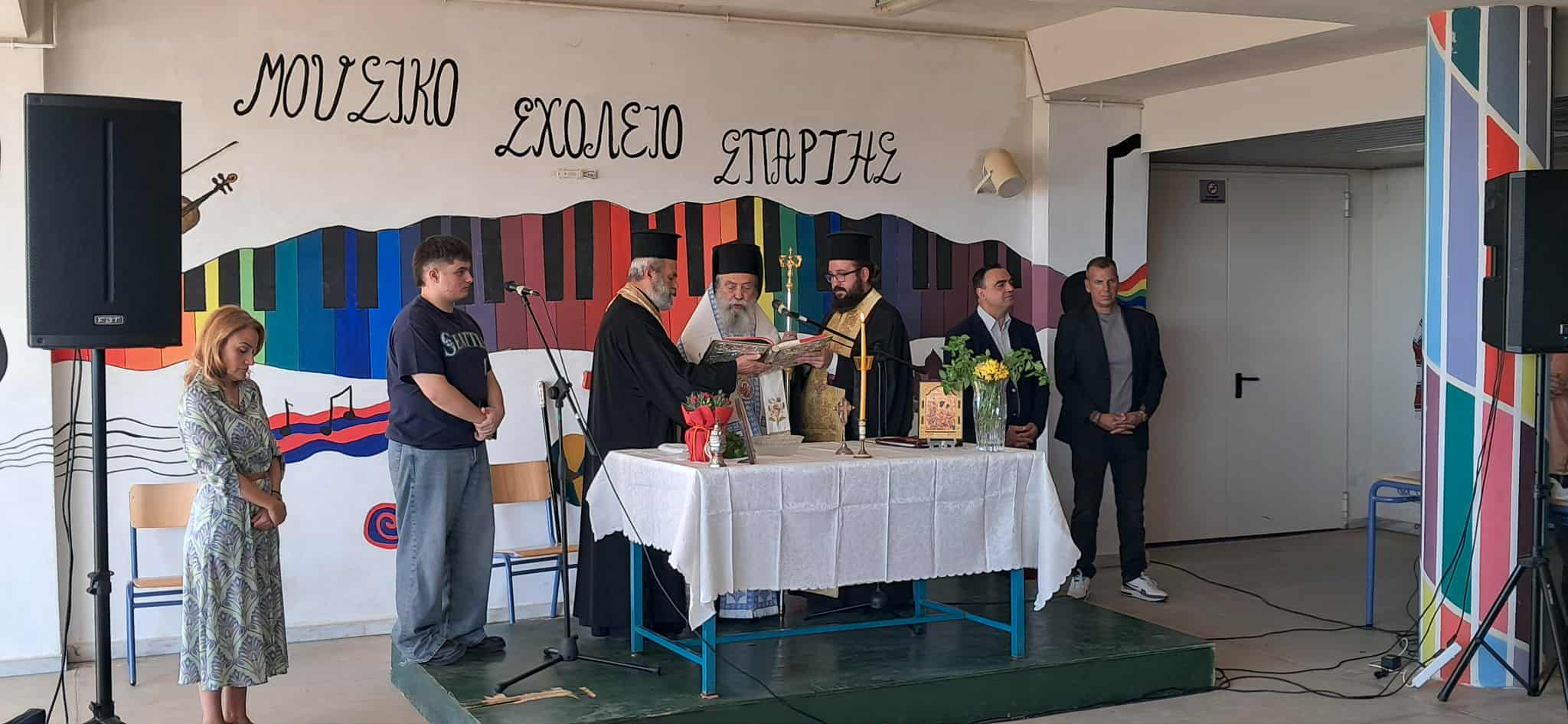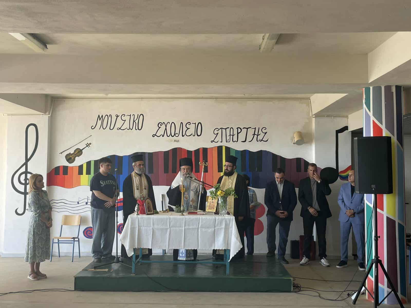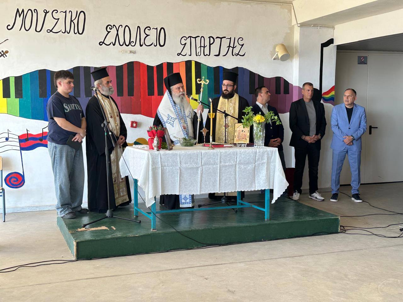 Στη συνέχεια, ο σεβασμιώτατος μετέβη στο Μουσικό Σχολείο Σπάρτης, όπου επίσης τέλεσε τον αγιασμό και απηύθυνε τον πατρικό του λόγο σε παιδιά και εκπαιδευτικούς.
