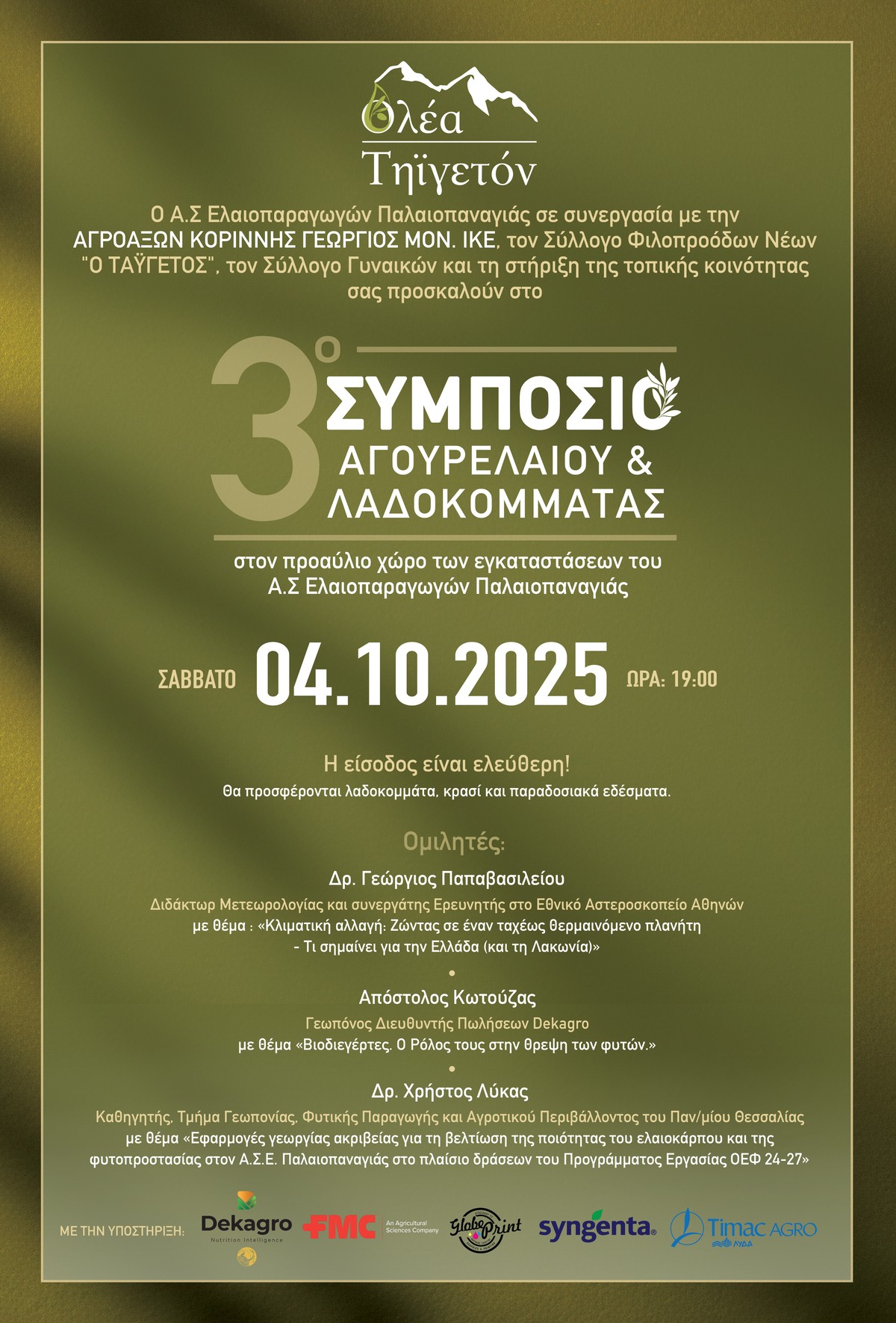 Η παράδοση, η επιστημονική γνώση και η γιορτινή διάθεση συναντώνται ξανά στην Παλαιοπαναγιά Σπάρτης, όπου το Σάββατο 4 Οκτωβρίου, στις 19:00, θα πραγματοποιηθεί το 3ο Συμπόσιο Αγουρέλαιου και Λαδοκομμάτας. Ο Αγροτικός Συνεταιρισμός Παλαιοπαναγιάς, σε συνεργασία με την εταιρεία Αγροάξων Κορίνης Γεώργιος, τον Σύλλογο Φιλοπρόοδων Νέων «Ο Ταΰγετος», τον Σύλλογο Γυναικών και με την υποστήριξη της Τοπικής Κοινότητας, διοργανώνουν μία πολυδιάστατη εκδήλωση στον προαύλιο χώρο του Συνεταιρισμού, γεμάτη γεύσεις, γνώση και μουσική.