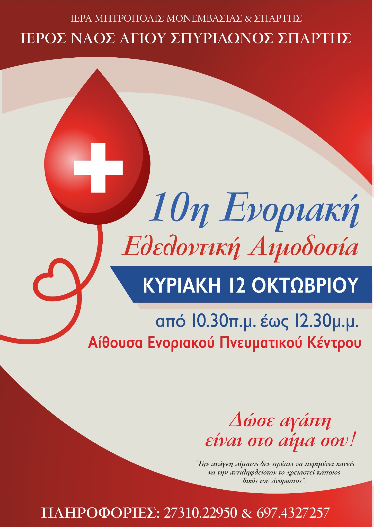 Με σύνθημα «Δώσε αγάπη, είναι στο αίμα σου!» ο Ιερός Ναός Αγίου Σπυρίδωνος Σπάρτης, υπό την αιγίδα της Ιεράς Μητροπόλεως Μονεμβασίας και Σπάρτης, διοργανώνει την 10η ενοριακή εθελοντική αιμοδοσία, την Κυριακή 12 Οκτωβρίου, από τις 10:30 π.μ. έως τις 12:30 μ.μ., στην Αίθουσα του Ενοριακού Πνευματικού Κέντρου. Πρόκειται για μια πρωτοβουλία βαθιάς κοινωνικής ευαισθησίας που έχει πλέον καθιερωθεί στην τοπική κοινότητα, με στόχο την ενίσχυση των αποθεμάτων αίματος και την υποστήριξη συνανθρώπων μας που το έχουν ανάγκη.