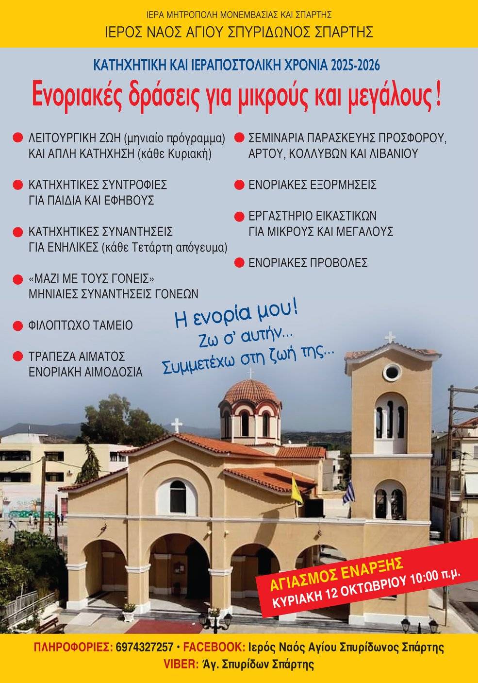 Με σύνθημα «Η ενορία μου! Ζω σ’ αυτήν… Συμμετέχω στη ζωή της…», ο Ιερός Ναός Αγίου Σπυρίδωνος Σπάρτης ανακοινώνει την έναρξη της νέας Κατηχητικής και Ιεραποστολικής Χρονιάς 2025-2026, προσκαλώντας μικρούς και μεγάλους να συμμετάσχουν ενεργά στις δράσεις της ενορίας.