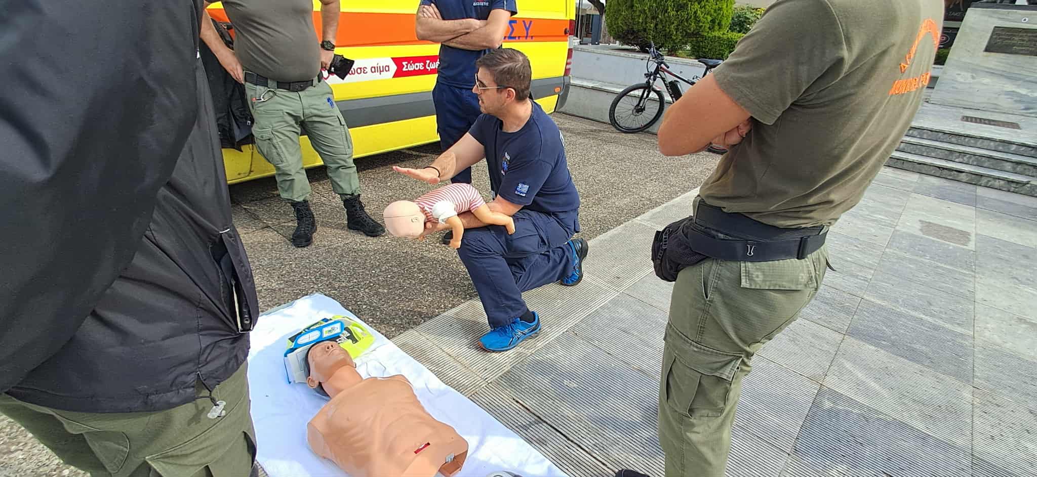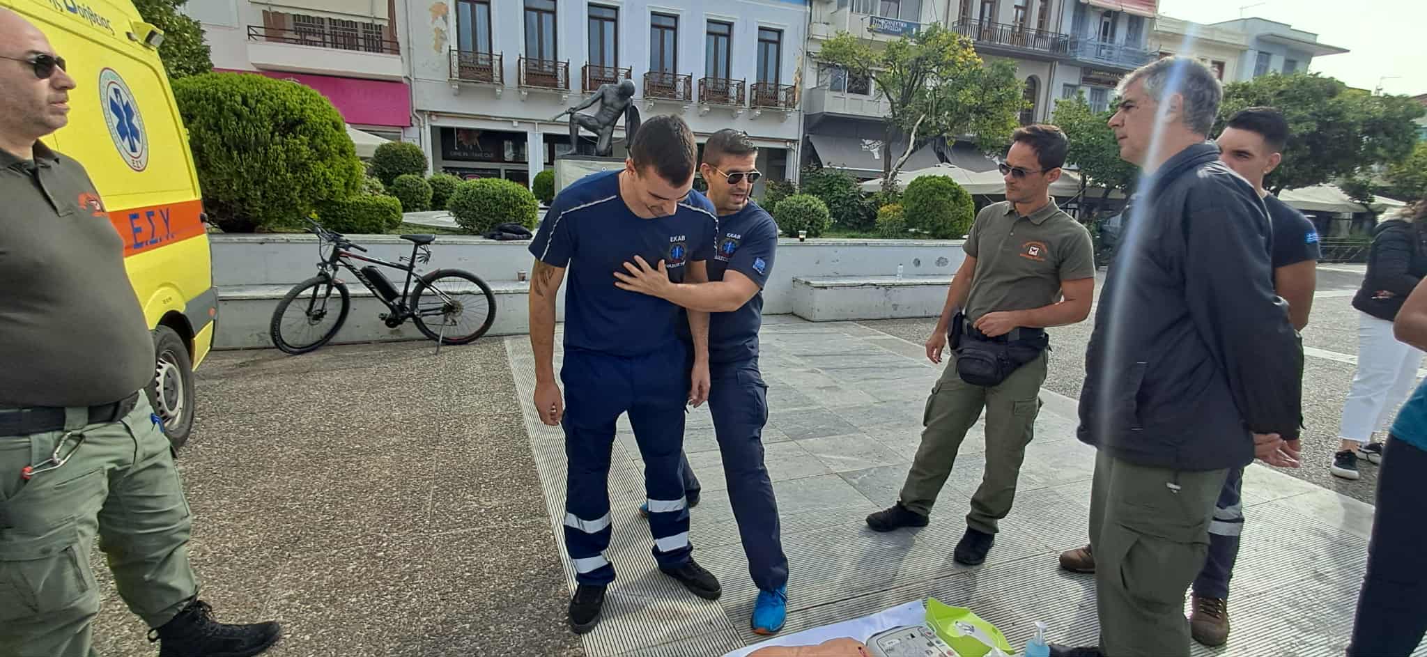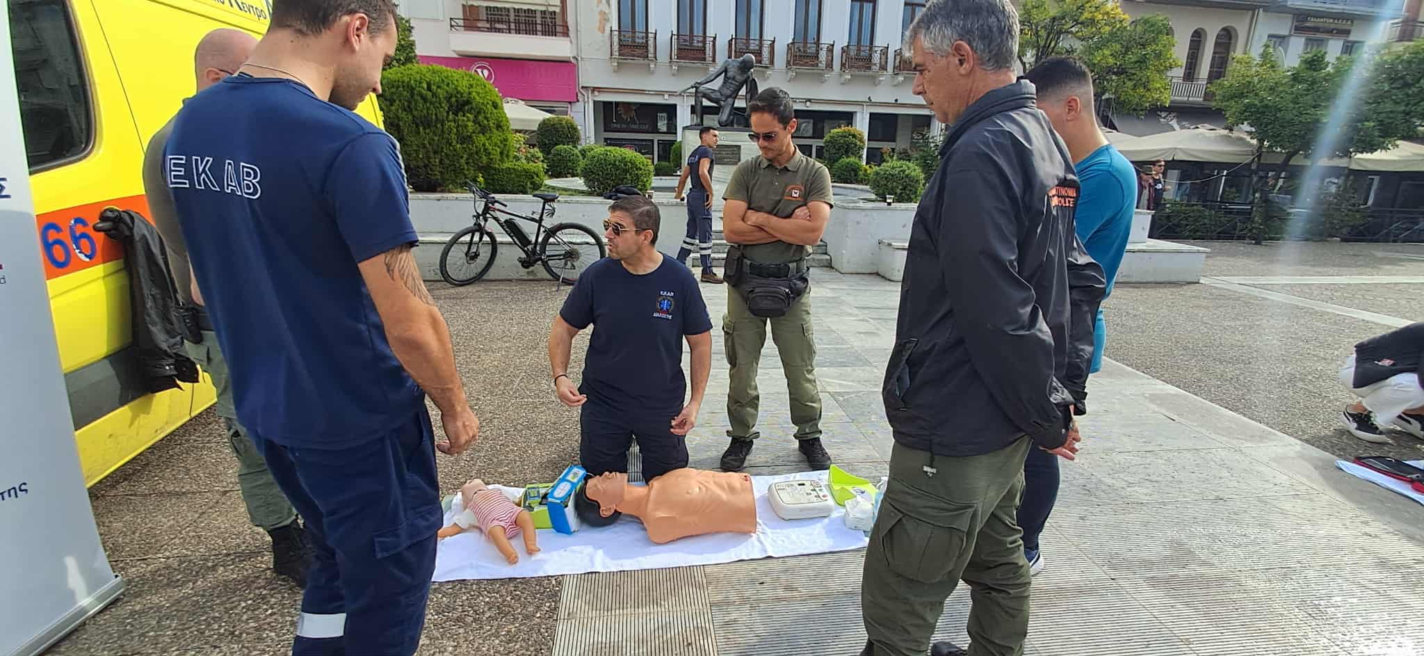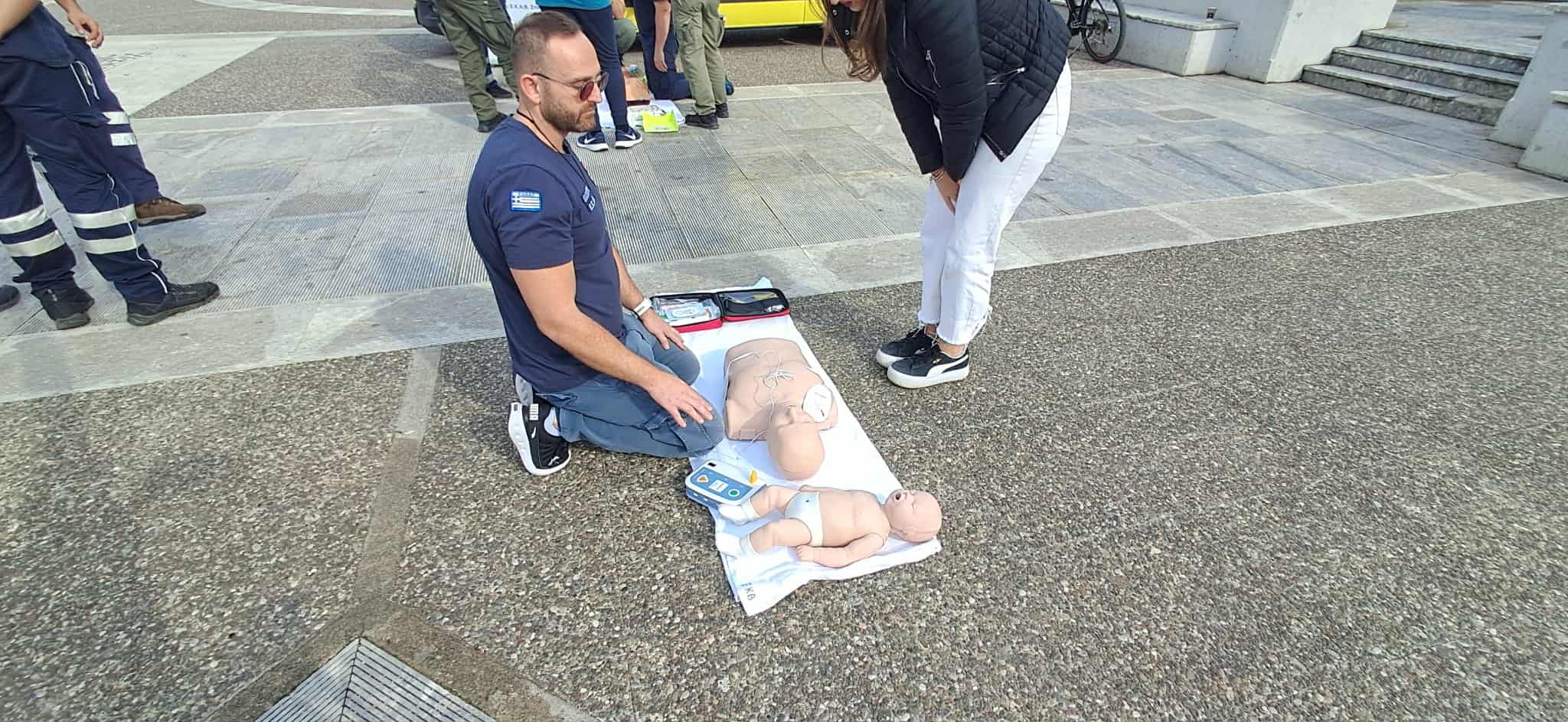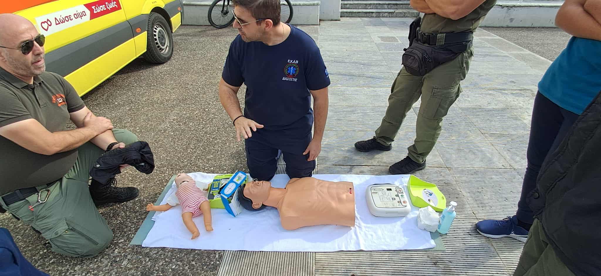 Οι διασώστες, νοσηλευτές και ιατροί του ΕΚΑΒ πραγματοποίησαν επιδείξεις με προπλάσματα και εκπαιδευτικούς απινιδωτές, δείχνοντας βήμα-βήμα πώς μπορεί κάποιος πολίτης να προσφέρει άμεση και κρίσιμη βοήθεια μέχρι να φτάσει το ασθενοφόρο.