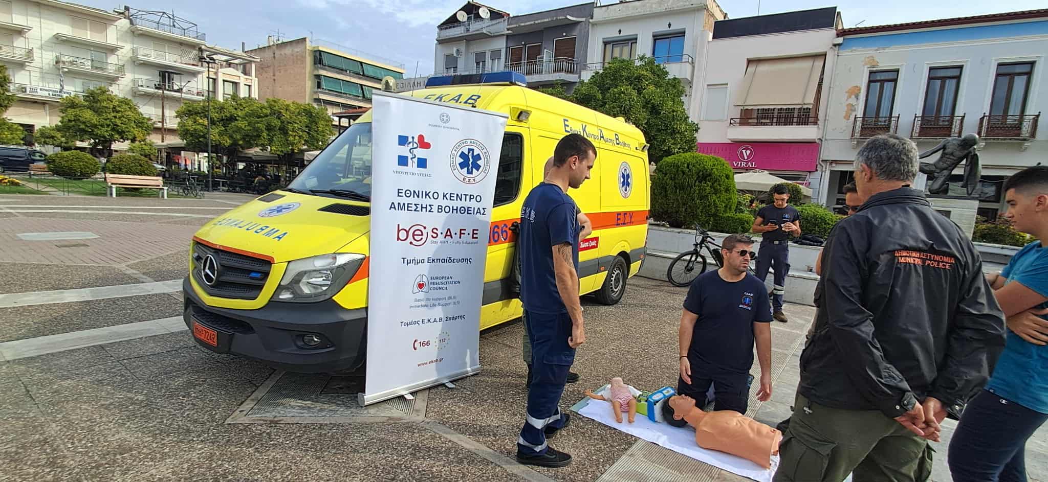 Μια ξεχωριστή και ουσιαστική δράση ενημέρωσης και εκπαίδευσης στην παροχή πρώτων βοηθειών πραγματοποίησε το ΕΚΑΒ Σπάρτης, στην κεντρική πλατεία της πόλης, με αφορμή την Παγκόσμια Ημέρα Επανεκκίνησης Καρδιάς (16 Οκτωβρίου).