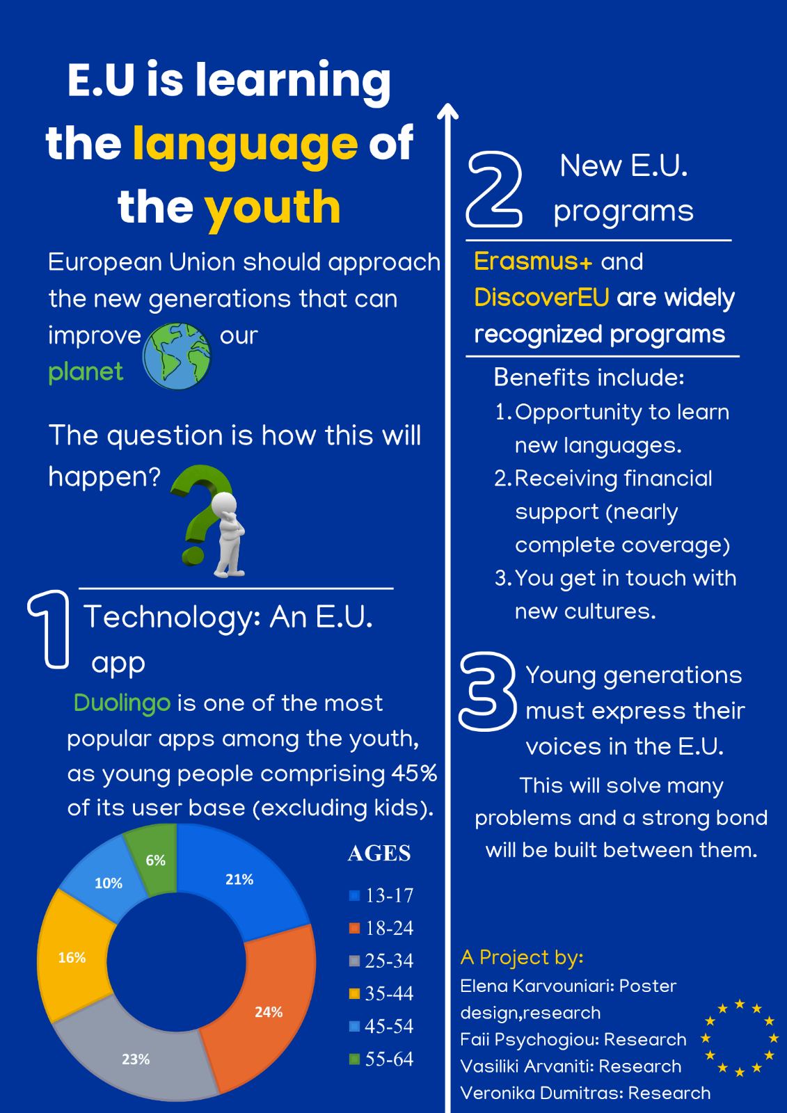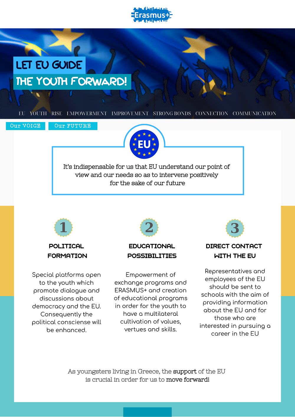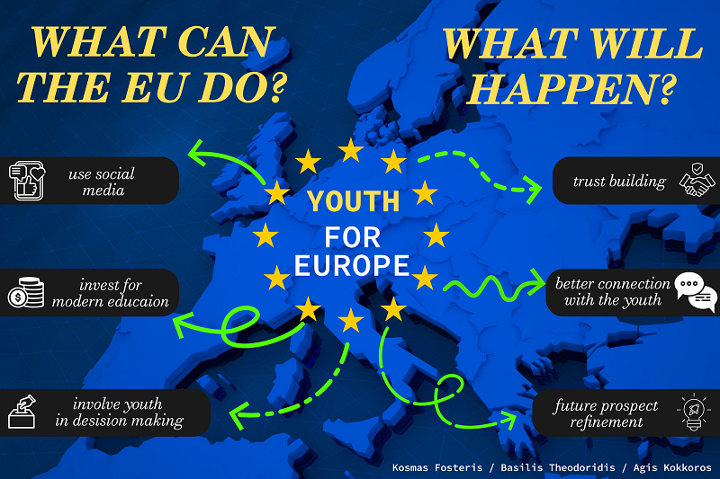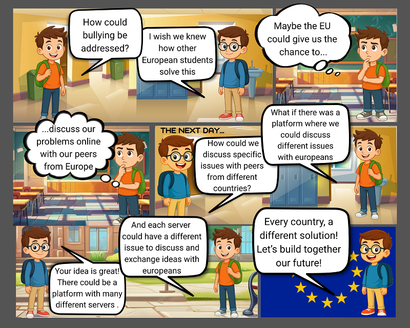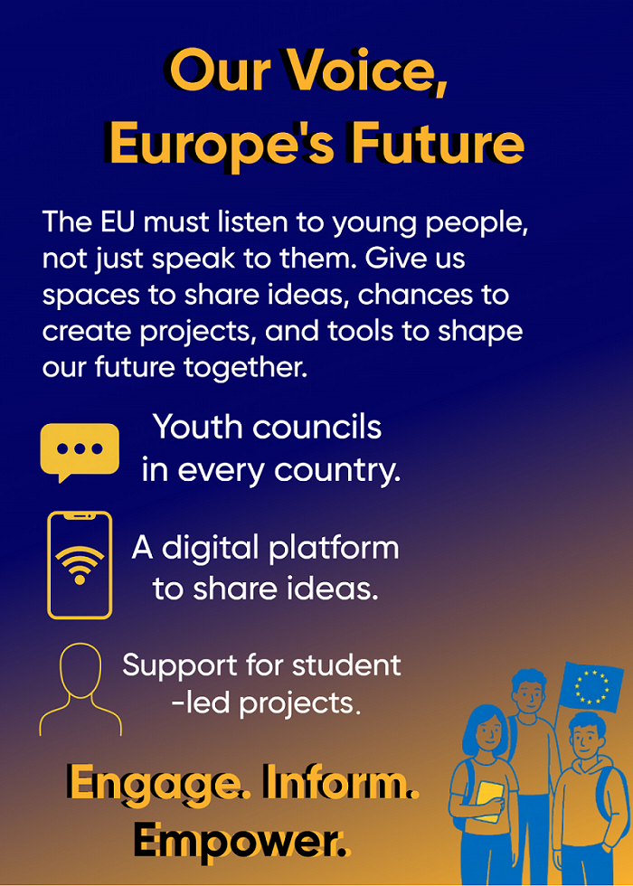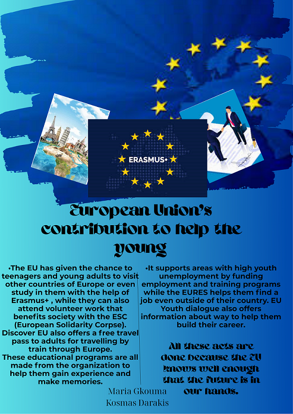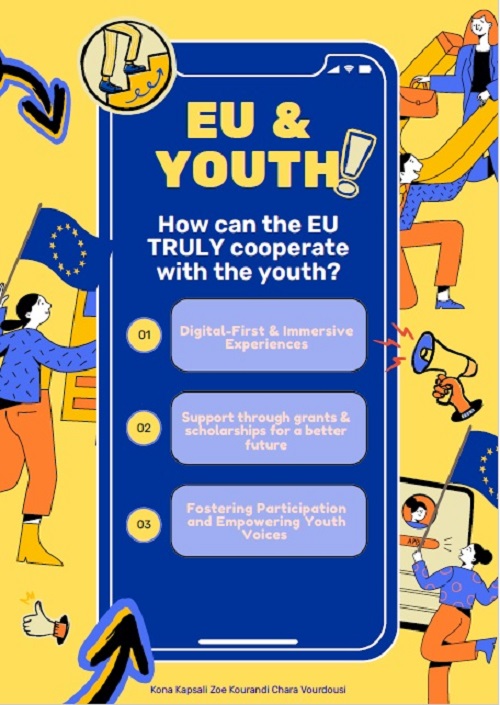 Οι μαθητές του σχολείου δίνουν δυναμικά το «παρών» με μια έκθεση έργων υπό τον τίτλο «Ενίσχυση του Δεσμού: Πώς η ΕΕ μπορεί πραγματικά να συνεργαστεί με τους νέους». Κόμικς, βίντεο, αφίσες, φωτογραφίες και δημιουργικά κείμενα αποτυπώνουν τις ιδέες, τη φαντασία και τη φωνή των μαθητών για μια Ευρώπη που ακούει τους νέους και τους δίνει ενεργό ρόλο στο μέλλον της.