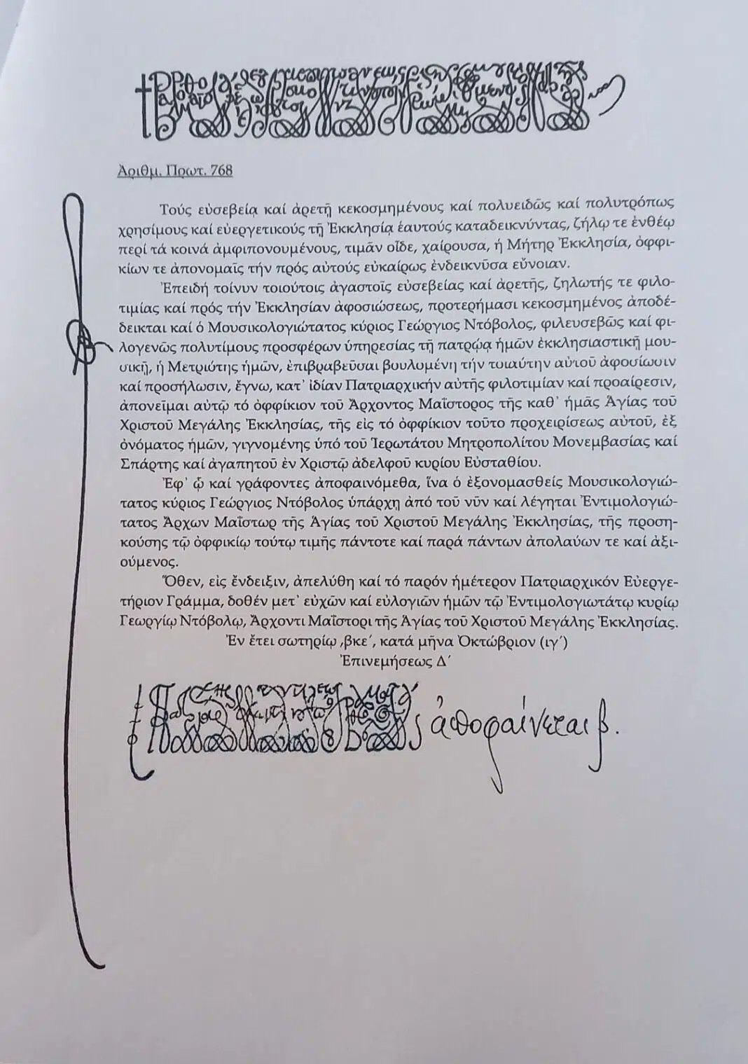 Ο καταξιωμένος Λάκωνας πρωτοψάλτης, Γεώργιος Ντόβολος, απέσπασε μία από τις υψηλότερες τιμητικές διακρίσεις της Ορθοδοξίας, αναγορευόμενος σε Άρχοντα Μαΐστορα της Μεγάλης του Χριστού Εκκλησίας από τον Παναγιώτατο Οικουμενικό Πατριάρχη κκ Βαρθολομαίο. Πρόκειται για τίτλο που αποδίδεται από το Οικουμενικό Πατριαρχείο Κωνσταντινουπόλεως σε όσους διακρίνονται για την προσφορά τους στη βυζαντινή μουσική και ψαλτική παράδοση. Η επίσημη απονομή του οφικίου θα πραγματοποιηθεί στις 7 Νοεμβρίου στα Νιάτα Δήμου Ευρώτα, τόπο καταγωγής του Γ. Ντόβολου, από τον σεβασμιώτατο Μητροπολίτη Μονεμβασίας και Σπάρτης κ. Ευστάθιο.
