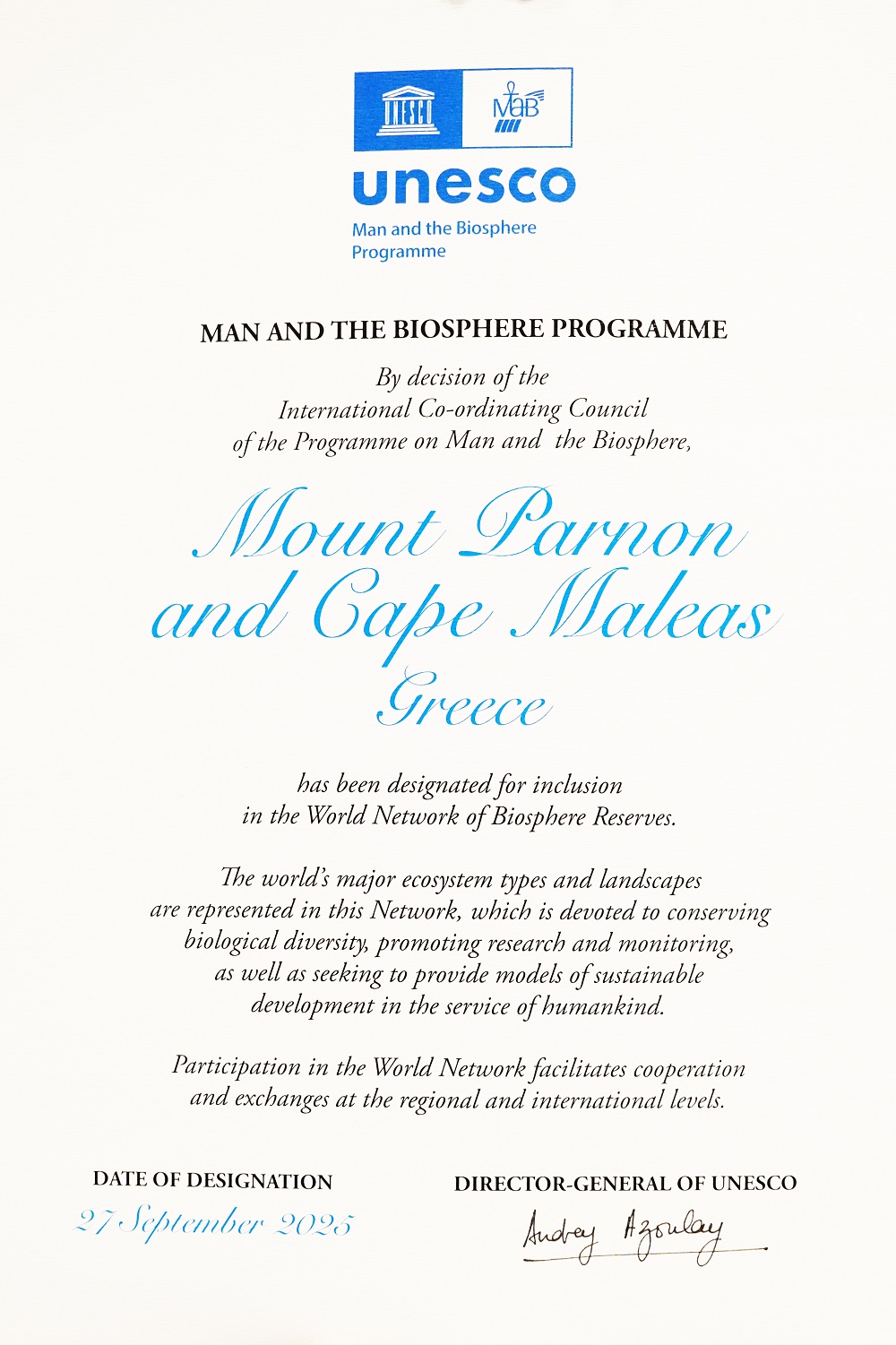 Ένας διεκδικούμενος στόχος κι όραμα ετών έλαβε «σάρκα κι οστά», με την ανακήρυξη της περιοχής Όρος Πάρνων-Ακρωτήριο Μαλέας ως Απόθεμα Βιόσφαιρας και της συνακόλουθης ένταξής της στο δίκτυο των Αποθεμάτων Βιόσφαιρας του προγράμματος Άνθρωπος & Βιόσφαιρα (MaB) της Unesco.