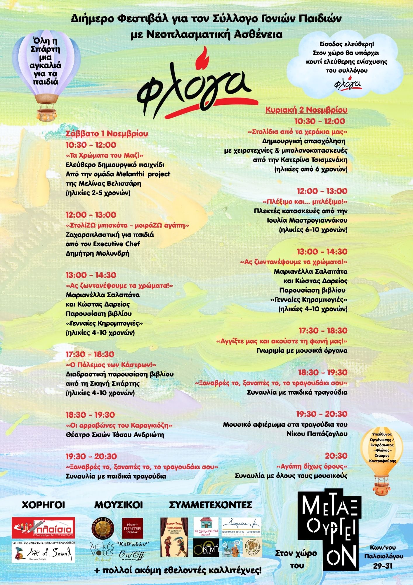 Το Σαββατοκύριακο 1 και 2 Νοεμβρίου, η καρδιά της Σπάρτης θα χτυπά δυνατά για τα παιδιά που δίνουν τη δική τους δύσκολη μάχη με τον καρκίνο. Ο σύλλογος γονιών παιδιών με νεοπλασματική ασθένεια «Φλόγα», σε συνεργασία με το Μεταξουργείον, διοργανώνουν ένα διήμερο φεστιβάλ γεμάτο αγάπη, δημιουργία και αλληλεγγύη, με ελεύθερη είσοδο για όλους.