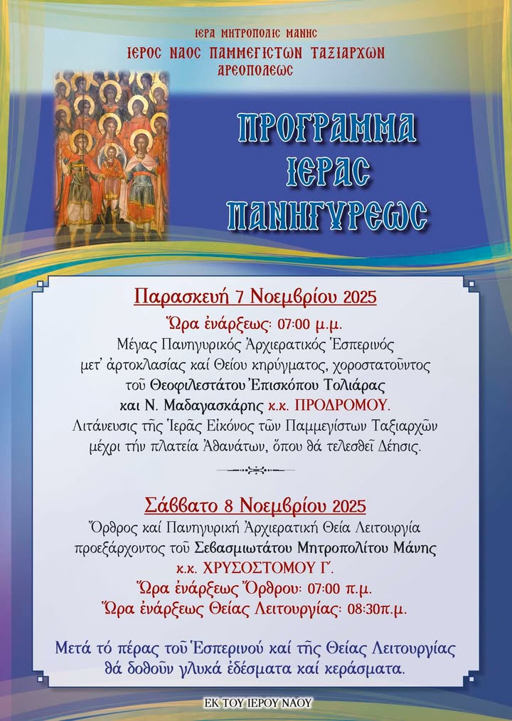 Ο πρόεδρος και τα μέλη του Εκκλησιαστικού Συμβουλίου καλούν τους πιστούς να συμμετάσχουν στις θρησκευτικές και εορταστικές εκδηλώσεις, τιμώντας τον ναό και τους Παμμέγιστους Ταξιάρχες με την παρουσία τους. Την πρόσκληση υπογράφει ο πανοσιολογιώτατος αρχιμανδρίτης και πρωτοσύγκελλος της Μητρόπολης Μάνης π. Συμεών Λαμπρινάκος.