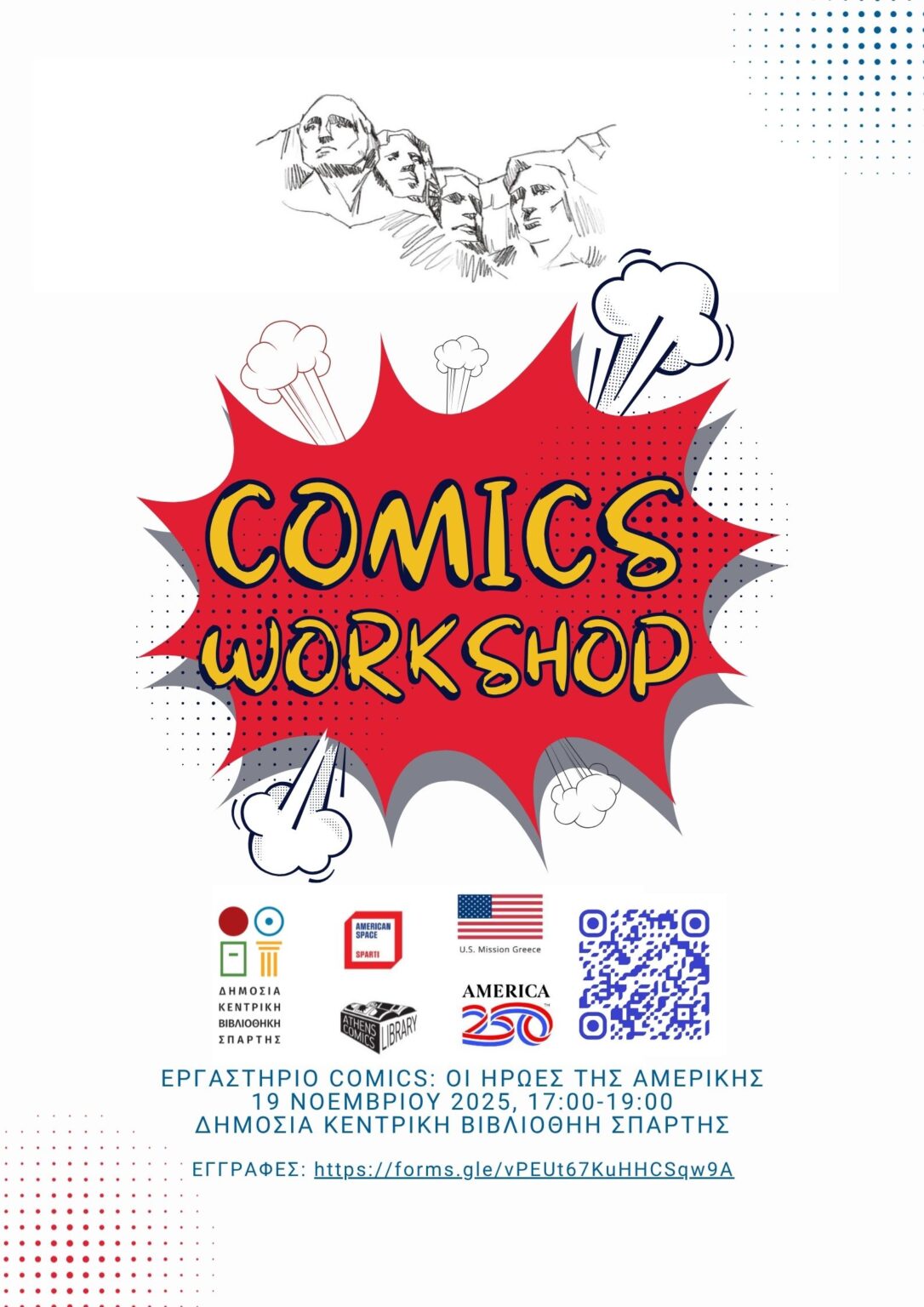 Ένα ξεχωριστό εκπαιδευτικό εργαστήριο comics θα πραγματοποιηθεί στη Σπάρτη, με αφορμή τη συμπλήρωση 250 χρόνων από την υπογραφή της Διακήρυξης της Ανεξαρτησίας των Ηνωμένων Πολιτειών Αμερικής. Η δράση με τίτλο «Οι Ήρωες της Αμερικής» προσφέρει στους μαθητές την ευκαιρία να γνωρίσουν με δημιουργικό τρόπο την αμερικανική ιστορία και τις προσωπικότητες που διαμόρφωσαν τον σύγχρονο κόσμο.