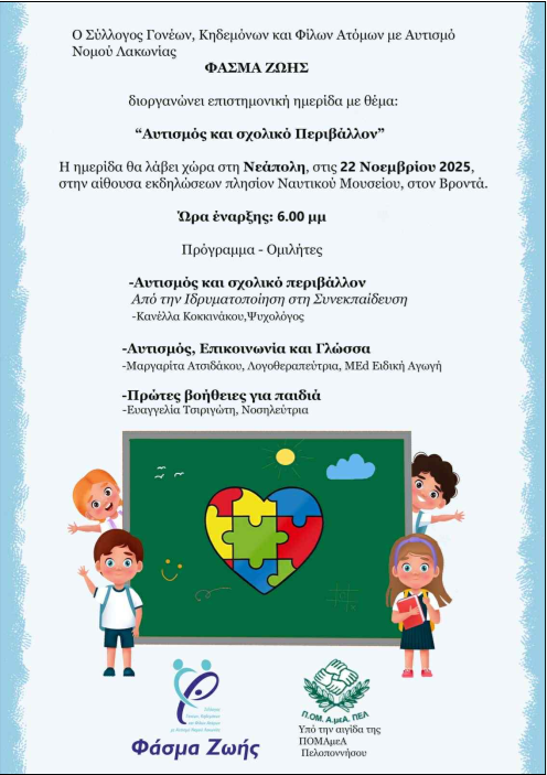 Μια σημαντική επιστημονική ημερίδα με θέμα «Αυτισμός και Σχολικό Περιβάλλον» διοργανώνει ο Σύλλογος Γονέων, Κηδεμόνων και Φίλων Ατόμων με Αυτισμό Νομού Λακωνίας – Φάσμα Ζωής, το Σάββατο 22 Νοεμβρίου, στη Νεάπολη, στην αίθουσα εκδηλώσεων πλησίον του Ναυτικού Μουσείου, στον Βροντά. Η έναρξη της ημερίδας έχει προγραμματιστεί για τις 6:00 μ.μ.