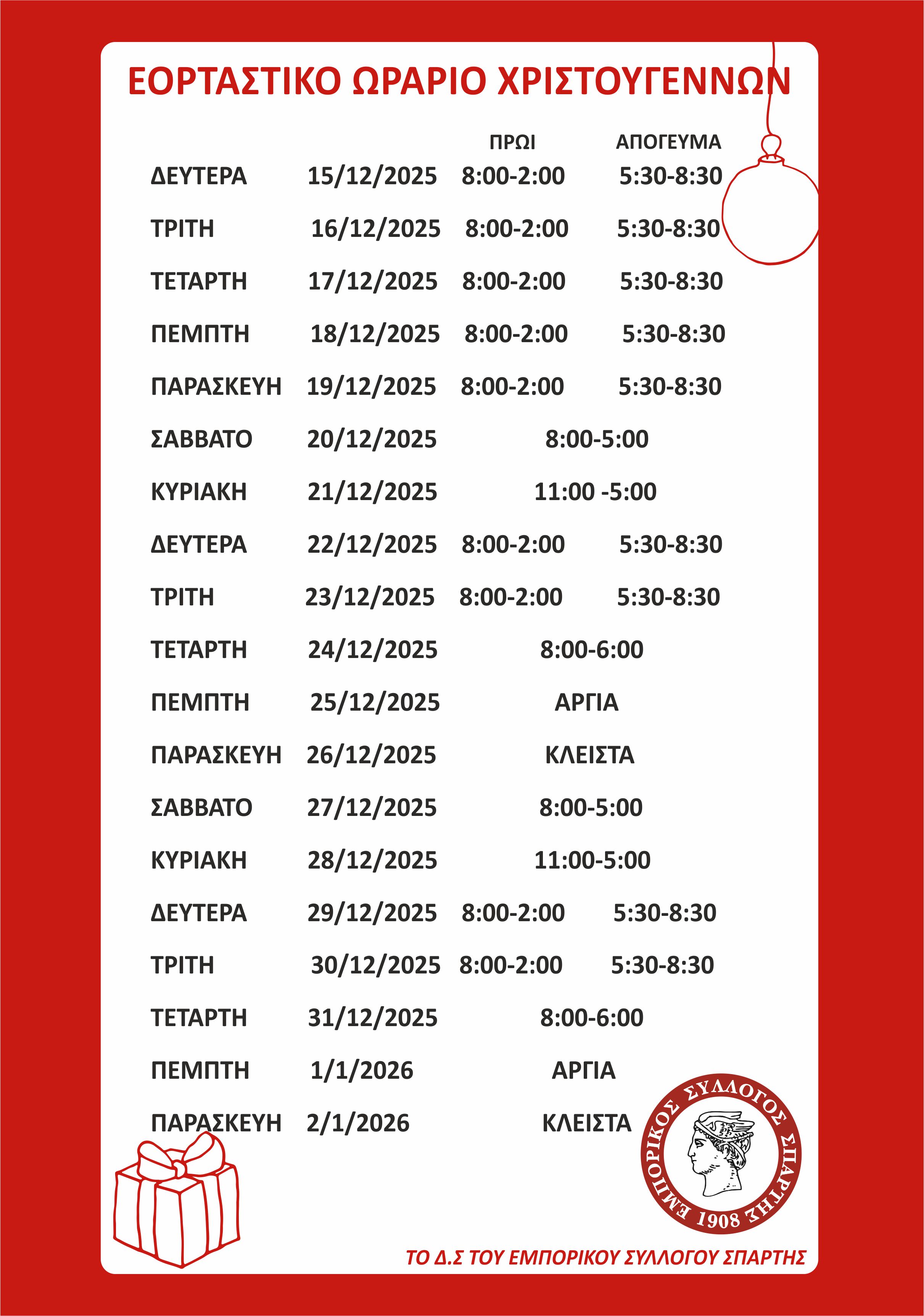 Στο πλαίσιο της ενημέρωσης των καταναλωτών, ο Εμπορικός Σύλλογος δημοσιεύει το αναλυτικό εορταστικό ωράριο των καταστημάτων για το διάστημα 15 Δεκεμβρίου 2025 – 2 Ιανουαρίου 2026: