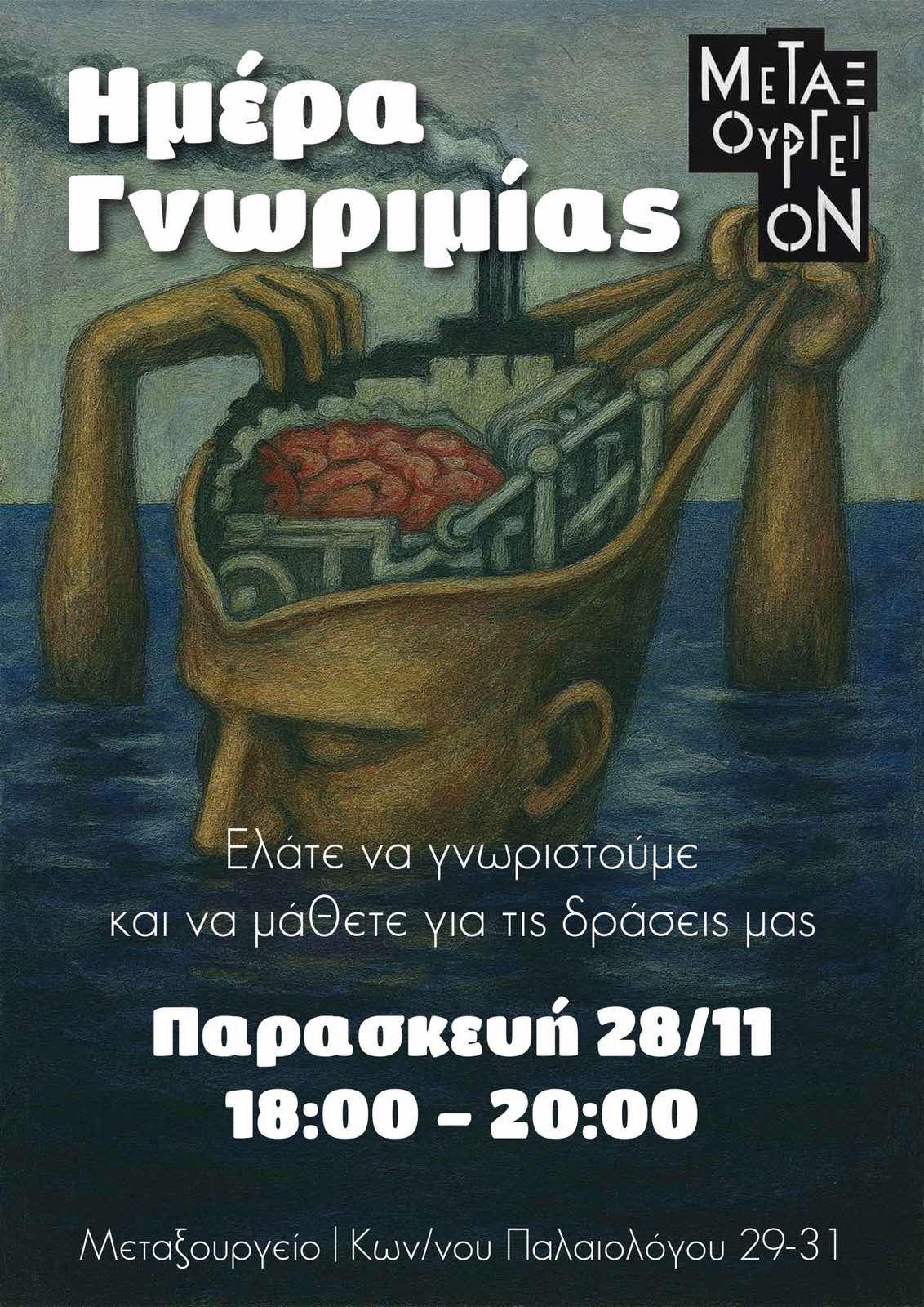 Το Μεταξουργείο ανοίγει τις πόρτες του και προσκαλεί το κοινό σε μια «Ημέρα Γνωριμίας», μια ανοιχτή συνάντηση για όλους όσοι θέλουν να ενημερωθούν και να έρθουν σε επαφή με τις δράσεις του. Σε ένα ζεστό και φιλόξενο περιβάλλον, οι επισκέπτες θα έχουν την ευκαιρία να γνωρίσουν από κοντά το έργο, το όραμα και τις πρωτοβουλίες της ομάδας, να συζητήσουν με τα μέλη και να ενημερωθούν για δυνατότητες συμμετοχής και συνεργασίας.