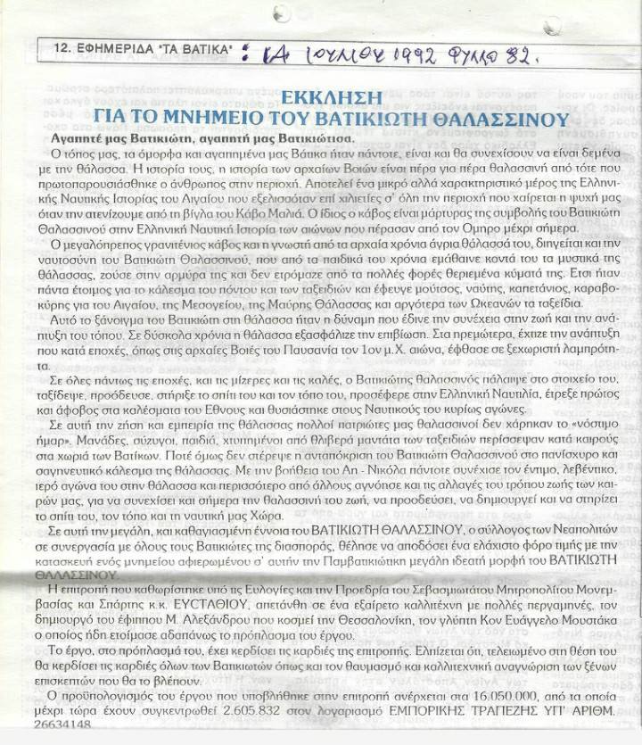 Το μνημείο αποτελεί αριστούργημα της ελληνικής γλυπτικής, εμπνευσμένο από τη θάλασσα και την ιστορική μνήμη των Βατικιώτων. Αξιοσημείωτο είναι ότι η πλάκα του μνημείου δεν αναφέρει το όνομα του καλλιτέχνη, γεγονός που προκαλεί θλίψη και αδικία για τον δημιουργό του.