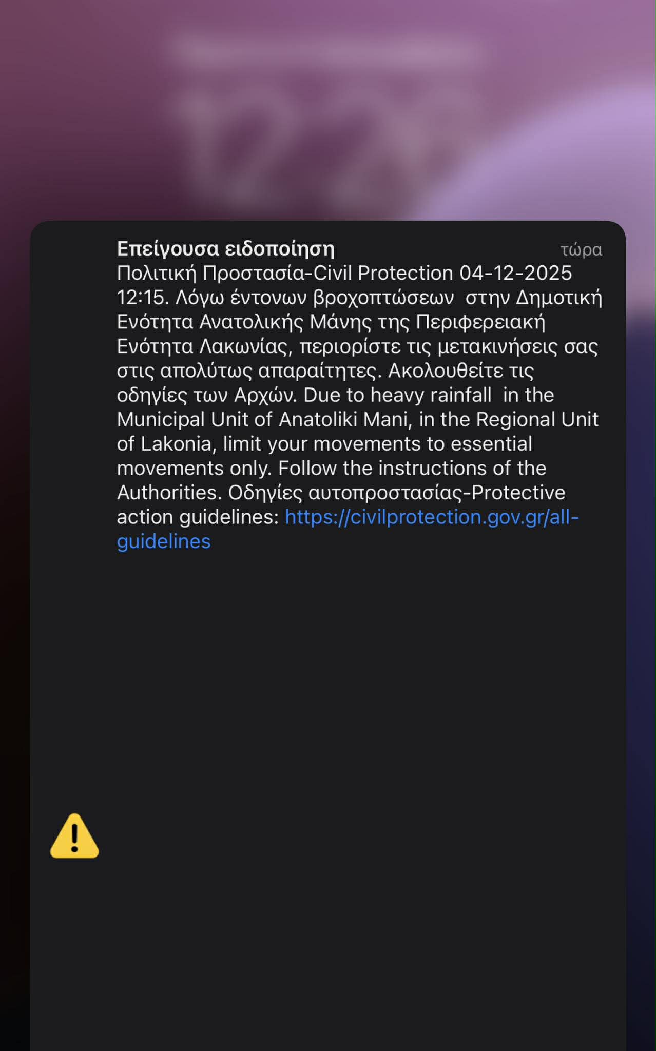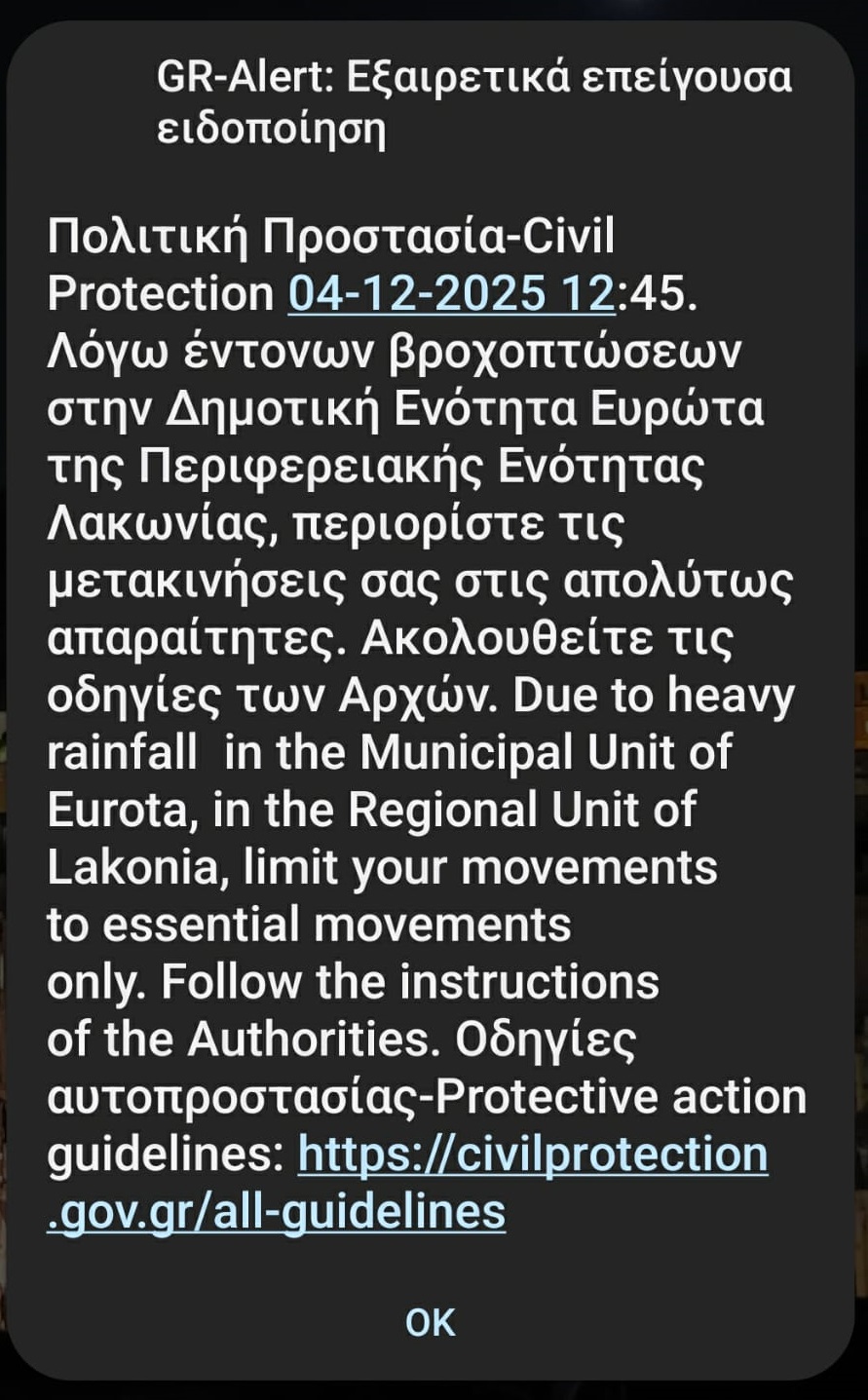Τον κώδωνα του κινδύνου έκρουσε και η Γενική Γραμματεία Πολιτικής Προστασίας, αποστέλλοντας μήνυμα του 112 στους κατοίκους των Δήμων Ανατολικής Μάνης και Ευρώτα. Το μήνυμα προειδοποιούσε για τις έντονες βροχοπτώσεις και ζητούσε από τους πολίτες να περιορίσουν τις μετακινήσεις στις απολύτως απαραίτητες και να ακολουθούν πιστά τις οδηγίες των Αρχών.