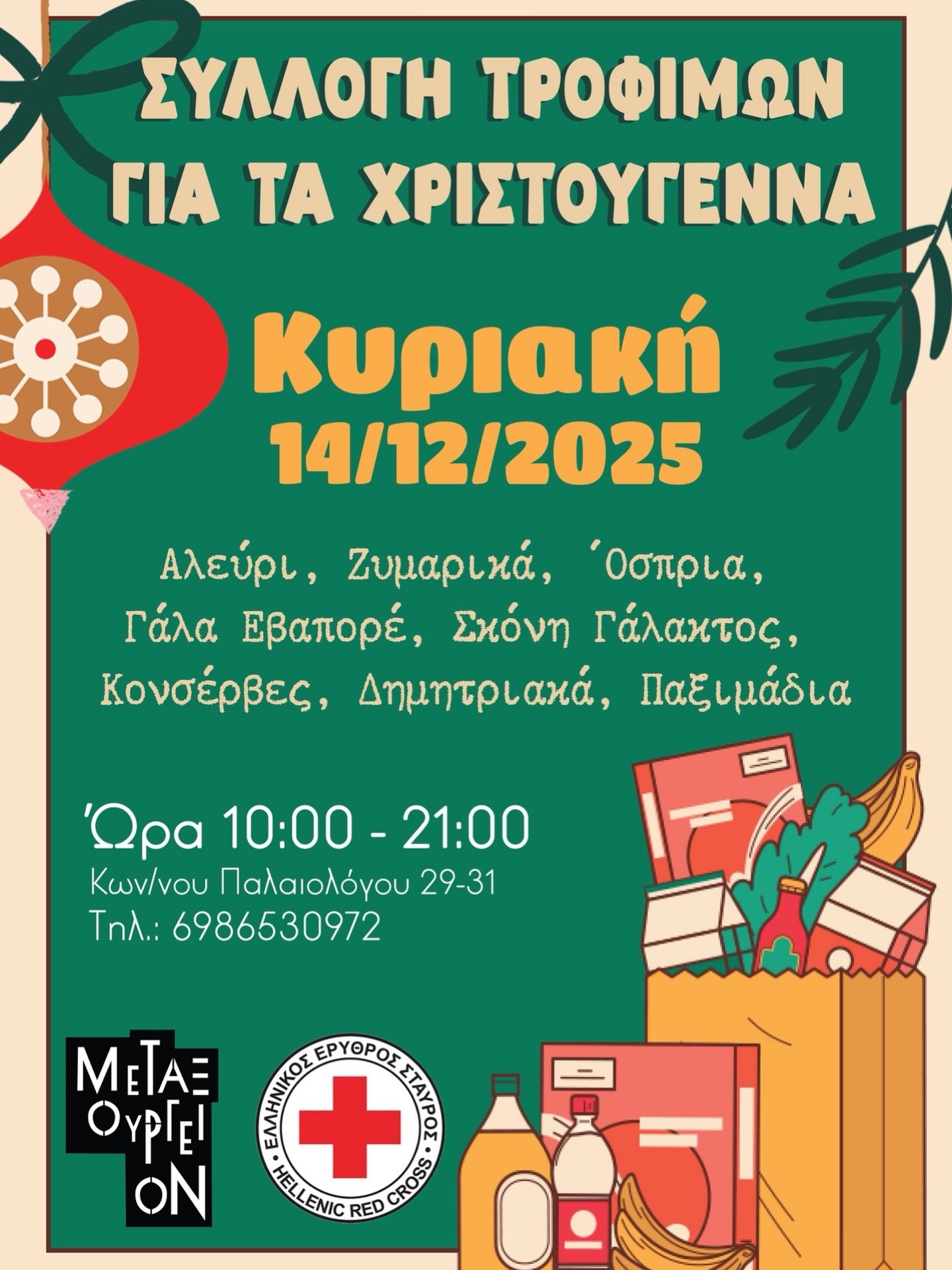 Με αφορμή τις εορτές των Χριστουγέννων, η ομάδα του «Μεταξουργείου» διοργανώνει μια σημαντική πρωτοβουλία ανθρωπιάς καλώντας όλους τους συμπολίτες μας να προσφέρουν βοήθεια σε οικογένειες που το έχουν ανάγκη. Την Κυριακή, 14 Δεκεμβρίου, από τις 10:00 έως τις 21:00, στο Μεταξουργείο (Κ. Παλαιολόγου 29–31), θα πραγματοποιηθεί συγκέντρωση βασικών ειδών διατροφής μακράς διάρκειας (αλεύρι, ζυμαρικά, όσπρια, γάλα εβαπορέ, σκόνη γάλακτος, κονσέρβες, δημητριακά, παξιμάδια), με στόχο να στηριχθούν συνάνθρωποι που αντιμετωπίζουν δυσκολίες.