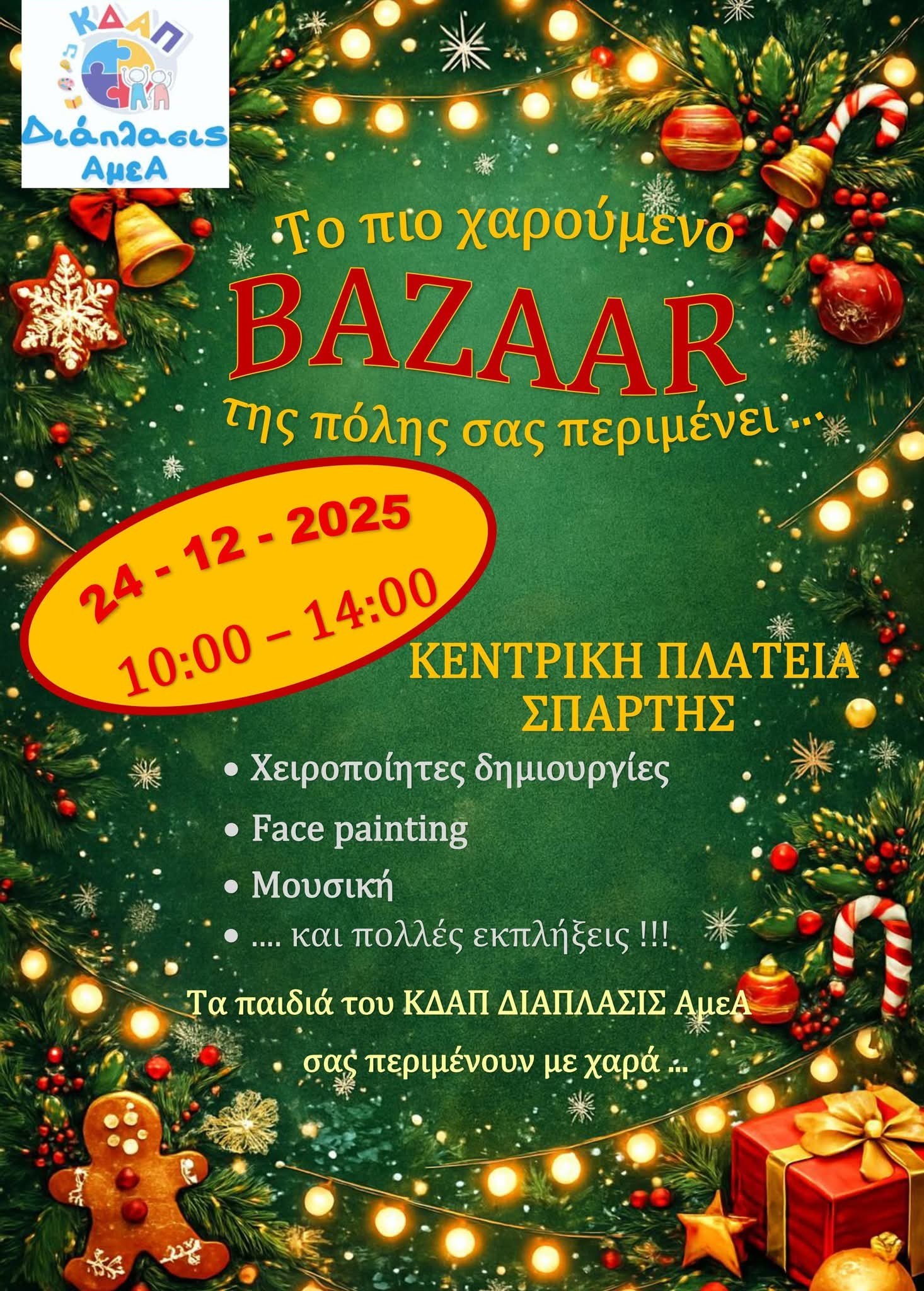 Μια ξεχωριστή χριστουγεννιάτικη εμπειρία υπόσχονται τα παιδιά του ΚΔΑΠ Διάπλασις ΑμεΑ, που διοργανώνουν το πιο χαρούμενο bazaar της πόλης, την Τρίτη 24 Δεκεμβρίου, στην κεντρική πλατεία Σπάρτης, από τις 10:00 το πρωί έως τις 14:00.