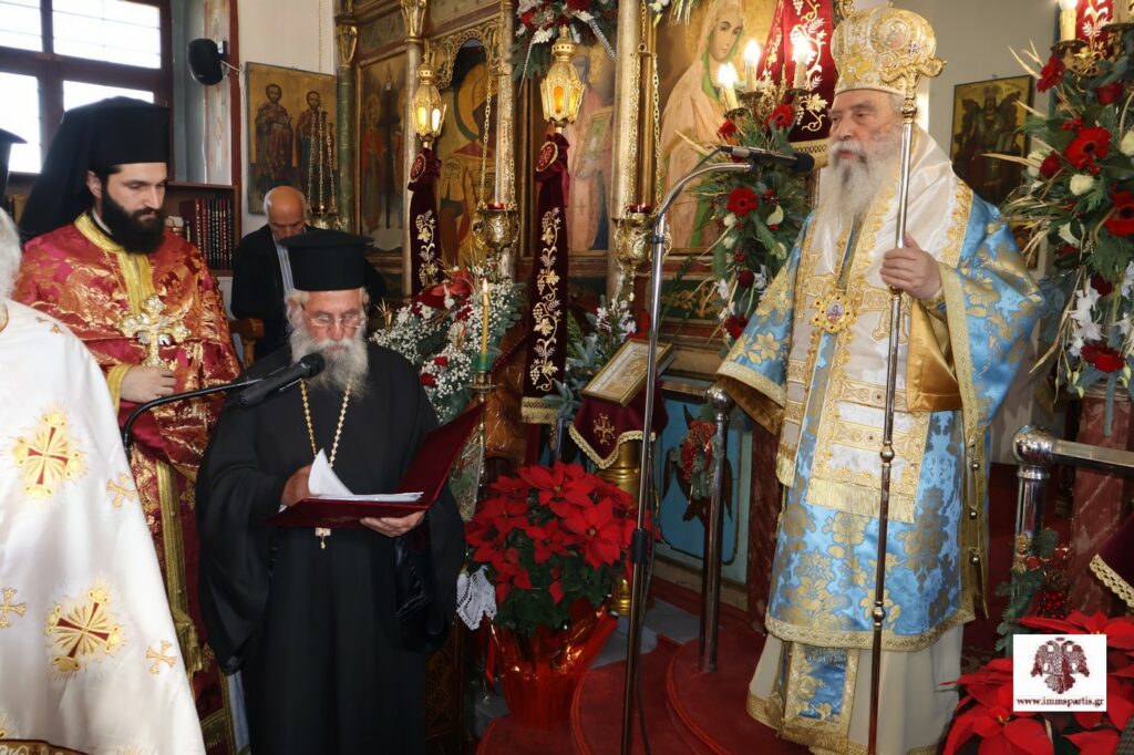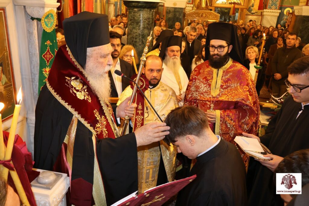 Αφού εψάλησαν τα εγκώμια του Αγίου και ευλογήθηκαν οι άρτοι, ο σεπτός Ποιμενάρχης χειροθέτησε Αναγνώστη έναν ευσεβή νέο της ενορίας, τον Κώστα Τσιριγώτη, μαθητή Λυκείου. Στη σύντομη προσλαλιά του, ο σεβασμιώτατος μίλησε με επαινετικά λόγια για το ήθος και τις ψαλτικές δυνατότητες του νέου Αναγνώστη, ενώ τον συμβούλευσε όταν ψέλνει «να έχει στο νου και την καρδιά του μόνο τον Τριαδικό Θεό, την Παναγία και τους Αγίους που εξυμνεί, χωρίς ίχνος έπαρσης». Παράλληλα, συνεχάρη τους γονείς του, τον πνευματικό του πατέρα και εφημέριο της Ενορίας Αγ. Σπυρίδωνος, πανοσιολογιώτατο αρχιμανδρίτη π. Σεραφείμ Κοσμά, ο οποίος έχει καταφέρει να έχει κοντά του τους νέους και τις νέες της περιοχής, καθώς και τους δασκάλους του στην ψαλτική. Ολοκληρώνοντας, ευχήθηκε στον χειροθετηθέντα «να έχει τη χάρη του Πανάγαθου Θεού και να συνεχίσει με τον ίδιο ζήλο να πορεύεται στον δρόμο της αρετής και της μάθησης».